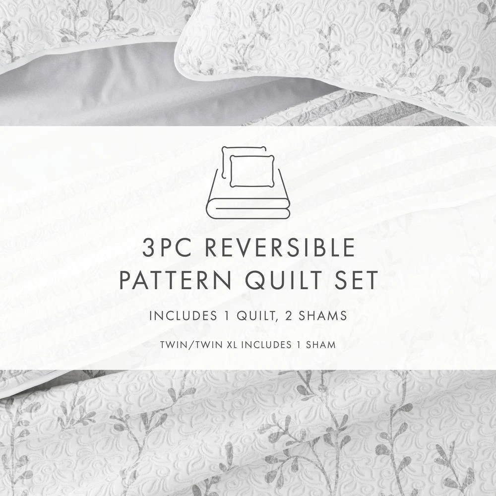Contact Us Add to Favorite Fast Shipping Hassle Free Return eBay Money Back Guarantee Authenticity Guarantee Features Reversible microfiber quilt enhances bedroom versatility Distressed stripe design adds timeless elegance Generously filled with artificial down for plush comfort Item Description Give your room a comfy new addition with this super soft reversible microfiber quilt and sham set. This pallet brings just the right amount of contemporary style to this beautiful arrangement of shihouette leaves. Reversing to a soft distressed stripe this set will keep you in harmony with nature. This quilt is classic addition to any bedroom. We've generously filled with artificial down, and each piece is double brushed to give it that super soft, cozy feel. Bedding Material: Microfiber Care Instructions: Machine Wash Color: Light Gray Color Family: Gray Decor Type: Bedroom Linen Decorative Accents: No Decorative Accents Features: Reversible,Soft Fill Material: Polyester Lifestage: Adult Linen Type: Quilt Set Material: Polyester (100%) Material Family: Microfiber Number of Pieces: 3 Pattern Type: Floral Returnable: 30-Day Set Includes: Quilt,Sham Size: Full/Queen Style: Farmhouse,Modern Thread Count: 0 Quilt/Coverlet Length (in.): 94 in Quilt/Coverlet Width (in.): 90 in Sham Length (in.): 20 in Sham Width (in.): 26 in About us Customer service is our top priority! Please be sure to read the description thoroughly to make sure that this is the item you want before making a purchasing decision. If you have any questions about this item, please contact us via eBay messages before placing your order. We make every effort possible to accurately describe and depict the items. Please be aware that slight variations in color may be due to differences in lighting and computer monitor resolutions. All items are in stock at the time of listing; however, in the unlikely and unforeseen event that we are unable to fulfill your order through any of our networked warehouses, we will notify you as quickly as possible and offer you a 100% refund on your purchase. Thank you for shopping with us. We appreciate your business! Payment PayPal is our preferred method of payment. If you do not have a PayPal account, all major credit cards are gladly accepted through PayPal as the payment processor. PayPal offers great buyer and seller protection. Your order will be processed pending receipt of cleared payment through PayPal. Sales tax may be charged depending on your location. Shipping We provide fast, free shipping. Most items are shipped within 3-5 business days of receiving cleared payment. We ship to the lower 48 contiguous United States only. We do not ship to P.O. Boxes or APOs. For select items, we ship internationally through eBay?s Global Shipping Program. We do ship most of our smaller items internationally using eBays Global Shipping Program. If ordering electrical items outside of the U.S., please note that they will come equipped with a standard U.S. voltage plugs. You will need a suitable adapter to use the item in your country. Certain restrictions apply. Standard or Economy Shipping is ALWAYS FREE! You will be notified via eBay messages as soon as your items ship. Special Notice for Freight Items: If an item ships via Freight (Truck) Delivery, a valid phone number will be required so that we can contact you to schedule delivery. The item may be delivered with curbside delivery. An adult signature will be required. Please be sure to have available help on hand to assist you with moving the item to the desired location in or outside of your home. Freight items must be inspected upon delivery. In the unlikely event that damaged is observed, you MUST refuse delivery and note the damage on the shipping receipt and send it back via the Freight carrier. Returns will not be accepted on Freight items after they have been delivered, inspected, and the driver has left the premises. Returns We offer a 30 day return/exchange policy for most of our products. You can request a refund if you are dissatisfied for any reason with your product. (Restocking Fee May Apply). Only factory defects are accepted as a reason for a return. In the case of factory defects, if available, we will replace the product for you. When returning an item, it must be in all of the original packaging and include all of the original accessories or items that came with it. The item and package should be in original and perfect condition. You will be required to cover shipping on the return of non-defective items. All returns MUST be done within 30 days of date of purchase. Please note that we cannot give refunds or replacements after the 30 day limit has expired. When sending in a return, please note that it can take up to 7 business days for the return to be processed. We do our best to process as quickly as possible. We are extremely fair, and in the rare event of something out of the ordinary happening with our products or shipping, we will gladly work with you to find a fair resolution. Disclaimer Were sorry, but we do not honor product exchange requests. If you need to exchange an item received, you will need to go through the normal returns process identified in our returns section and then order the correct item, if it is still available. Orders are processed immediately and dispatched to fulfillment as soon as they are received. For this reason, we are typically unable to honor cancellation requests. If you need to cancel the transaction, please contact us as soon as possible and we will attempt to cancel the order. If the order has gone too far through the fulfillment process, we will be unable to cancel. In that event, you would need to wait until you receive the item and go through the normal returns process as mentioned in the returns section of our policies. Payment Options Shop With Confidence Copyright ©2023, All rights reserved. Listed by Sku Fetch