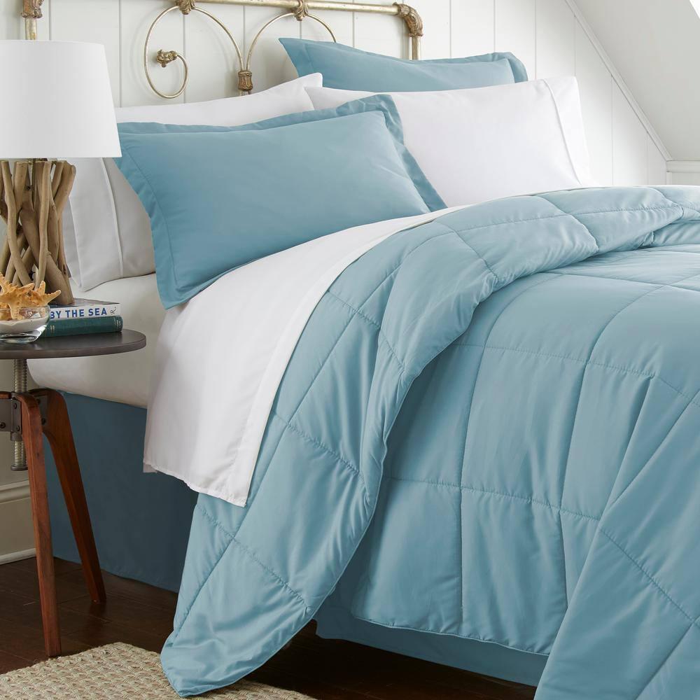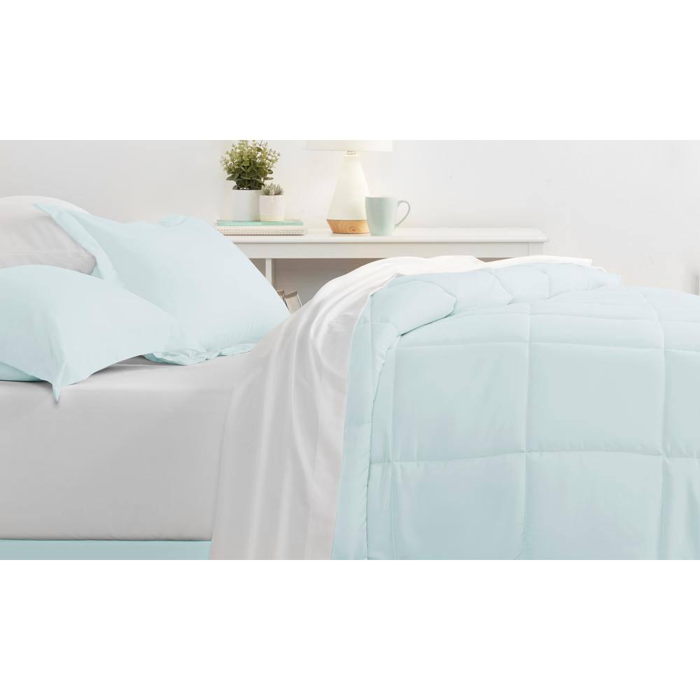Performance 6-Piece Aqua Twin Comforter Set Inclds 1-Flat 1-Fit 2-Pcs 2-Shm 1-Cmf 1-BDSK (Tw/TXL 1-Pcs 1-Shm) Comforter and Shams come in choice of color 16" deep pocket fitted sheets - perfect for over-sized mattresses The Becky Cameron 8-Piece Bed in a Bag is designed with your comfort in mind. Made of the finest imported double-brushed microfiber yarns, creating a new standard in softness and breath-ability, this 8-piece bedding set will make it incredibly hard to get out of bed in the morning. Our premium yarns are two times more durable than cotton, completely wrinkle free, and perfect for all seasons. Bedding Material: Microfiber Care Instructions: Machine Wash Color: Aqua Color Family: Blue Decor Type: Bedroom Linen Decorative Accents: No Decorative Accents Features: Hypoallergenic,Machine Washable Fill Material: Polyester Lifestage: Adult Linen Type: Bed in a Bag Material: Polyester (100%) Material Family: Microfiber Number of Pieces: 6 Origin: Imported Pattern Type: Solid Color Returnable : 30-Day Set Includes: Bed Skirt,Comforter,Pillowcases,Sheet Set Size: Twin Style : Classic Thread Count: 0 Comforter Length (in.): 90 in Comforter Width (in.): 70 in Sham Length (in.): 20 in Sham Width (in.): 30 in