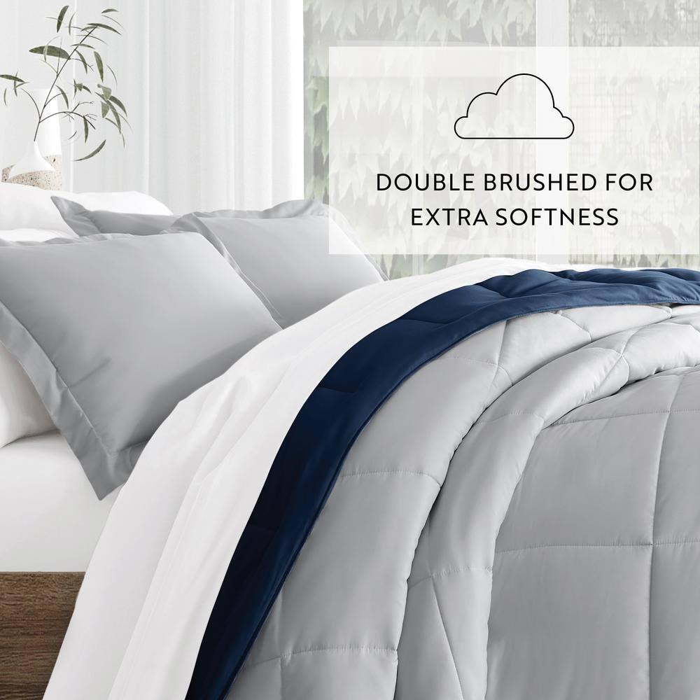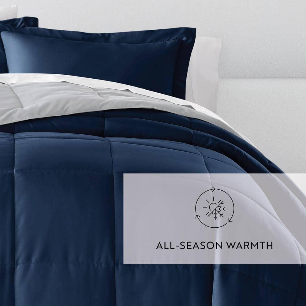 Lightweight shell offers optimum comfort Made of high-quality polyester to ensure longevity Machine-washable feature allows easy upkeep Give your bedding a brand new look and feel with this all season reversible down alternative comforter set. Presenting a quality alternative to down, it's incredible loft and down like feel makes it the perfect comforter to keep you cozy all year round. The end to end baffle box construction helps to eliminate the need for regular fluffing by preventing the fibers from shifting. Featuring a reversible design of aesthetically matched colors, this set is ideal for making quick style changes to your sleep space. Bedding Material: Microfiber Care Instructions: Machine Wash Color: Navy & Light Gray Color Family: Blue Decor Type: Bedroom Linen Decorative Accents: No Decorative Accents Features: Reversible,Soft Fill Material: Polyester Lifestage: Adult Linen Type: Comforter Set Material: Polyester (100%) Material Family: Polyester Number of Pieces: 3 Origin: Imported Pattern Type: Solid Color Returnable: 30-Day Set : Comforter,Sham Size: King/California King Style: Cottage,Farmhouse,Minimalist,Modern Thread Count: 0 Comforter Length (in.): 96 in Comforter Width (in.): 108 in Sham Length (in.): 20 in Sham Width (in.): 36 in