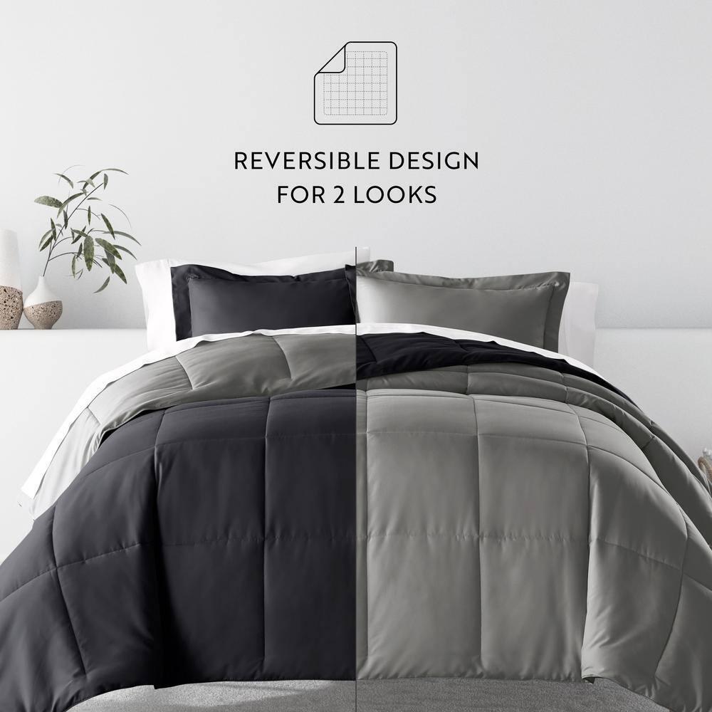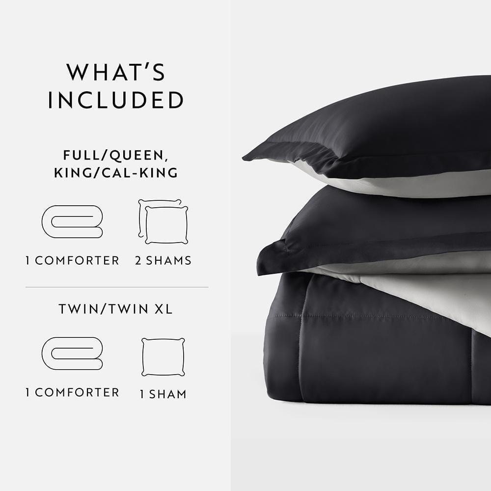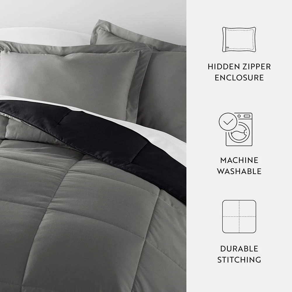 Contact Us Add to Favorite Contact Us Fast Shipping Hassle Free Return eBay Money Back Guarantee Authenticity Guarantee Features Reversible design offer quick style changes Double brushed 95 GSM microfiber shell for softness 180 GSM down alternative filling provides cozy sleep Item Description Give your bedding a brand new look and feel with this all season reversible down alternative comforter set. Presenting a quality alternative to down, it's incredible loft and down like feel makes it the perfect comforter to keep you cozy all year round. The end to end baffle box construction helps to eliminate the need for regular fluffing by preventing the fibers from shifting. Featuring a reversible design of aestheti call y matched colors, this set is ideal for making quick style changes to your sleep space. Bedding Material: Microfiber Care Instructions: Machine Wash Color: Black / Fog Color Family: Black Decor Type: Bedroom Linen Decorative Accents: No Decorative Accents Features: Reversible,Soft Fill Material: Polyester Lifestage: Adult Linen Type: Comforter Set Material: Polyester (100%) Material Family: Polyester Number of Pieces: 3 Origin: Imported Pattern Type: Solid Color Returnable : 30-Day Set : Comforter,Sham Size: King/California King Style : Cottage,Farmhouse,Minimalist,Modern Thread Count: 0 Comforter Length (in.): 96 in Comforter Width (in.): 108 in Sham Length (in.): 20 in Sham Width (in.): 36 in About us Customer service is our top priority! Please be sure to read the description thoroughly to make sure that this is the item you want before making a purchasing decision. If you have any questions about this item, please contact us via eBay messages before placing your order. We make every effort possible to accurately describe and depict the items. Please be aware that slight variations in color may be due to differences in lighting and computer monitor resolutions. All items are in stock at the time of listing; however, in the unlikely and unforeseen event that we are unable to fulfill your order through any of our networked warehouses, we will notify you as quickly as possible and offer you a 100% refund on your purchase. Thank you for shopping with us. We appreciate your business! Payment PayPal is our preferred method of payment. If you do not have a PayPal account, all major credit cards are gladly accepted through PayPal as the payment processor. PayPal offers great buyer and seller protection. Your order will be processed pending receipt of cleared payment through PayPal. Sales tax may be charged depending on your location. Shipping We provide fast, free shipping . Most items are shipped within 3-5 business days of receiving cleared payment. We ship to the lower 48 contiguous United States only. We do not ship to P.O. Boxes or APOs. For select items, we ship internationally through eBayâ??s Global Shipping Program. We do ship most of our smaller items internationally using eBays Global Shipping Program. If ordering electrical items outside of the U.S., please note that they will come equipped with a standard U.S. voltage plugs. You will need a suitable adapter to use the item in your country. Certain restrictions apply. Standard or Economy Shipping is ALWAYS FREE! You will be notified via eBay messages as soon as your items ship. Special Notice for Freight Items: If an item ships via Freight (Truck) Delivery, a valid phone number will be required so that we can contact you to schedule delivery. The item may be delivered with curbside delivery. An adult signature will be required. Please be sure to have available help on hand to assist you with moving the item to the desired location in or outside of your home. Freight items must be inspected upon delivery. In the unlikely event that damaged is observed, you MUST refuse delivery and note the damage on the shipping receipt and send it back via the Freight carrier. Returns will not be accepted on Freight items after they have been delivered, inspected, and the driver has left the premises. Returns We offer a 30 day return/exchange policy for most of our products. You can request a refund if you are dissatisfied for any reason with your product. (Restocking Fee May Apply). Only factory defects are accepted as a reason for a return. In the case of factory defects, if available , we will replace the product for you. When returning an item, it must be in all of the original packaging and include all of the original accessories or items that came with it. The item and package should be in original and perfect condition. You will be required to cover shipping on the return of non-defective items. All returns MUST be done within 30 days of date of purchase. Please note that we cannot give refunds or replacements after the 30 day limit has expired. When sending in a return, please note that it can take up to 7 business days for the return to be processed. We do our best to process as quickly as possible. We are extremely fair, and in the rare event of something out of the ordinary happening with our products or shipping , we will gladly work with you to find a fair resolution. Disclaimer Were sorry, but we do not honor product exchange requests. If you need to exchange an item received, you will need to go through the normal returns process identified in our returns section and then order the correct item, if it is still available . Orders are processed immediately and dispatched to fulfillment as soon as they are received. For this reason, we are typi call y unable to honor cancellation requests. If you need to cancel the transaction, please contact us as soon as possible and we will attempt to cancel the order. If the order has gone too far through the fulfillment process, we will be unable to cancel. In that event, you would need to wait until you receive the item and go through the normal returns process as mentioned in the returns section of our policies. Payment Options Shop With Confidence Copyright ©2023, All rights reserve