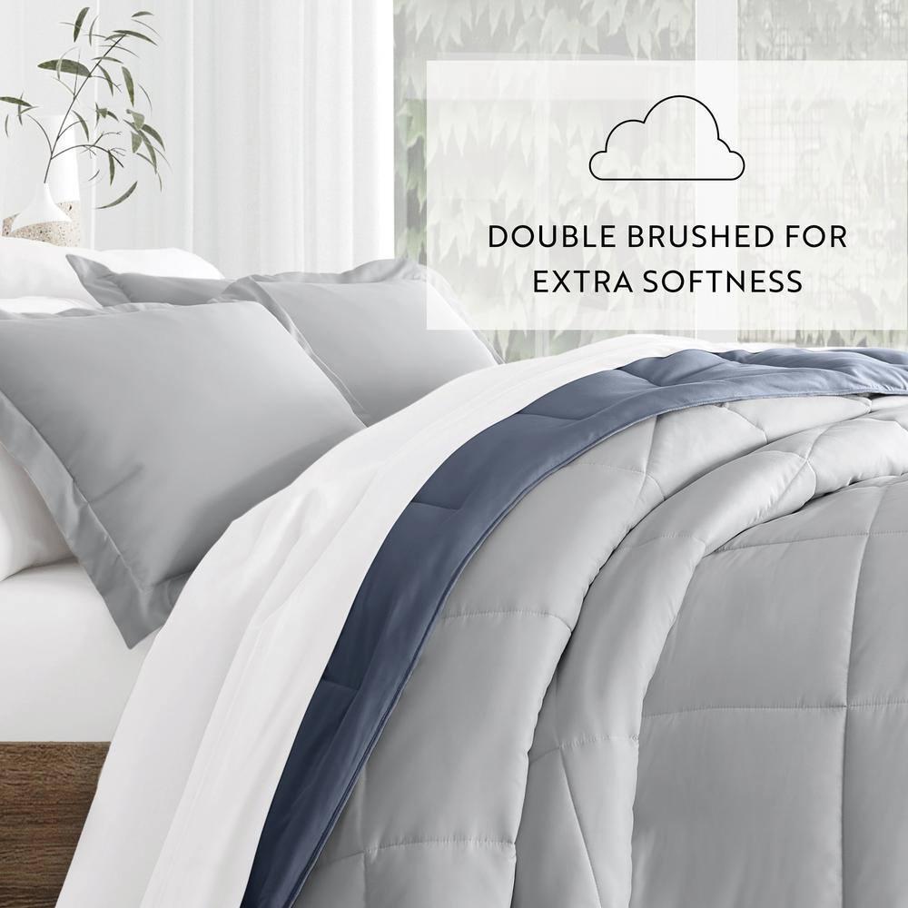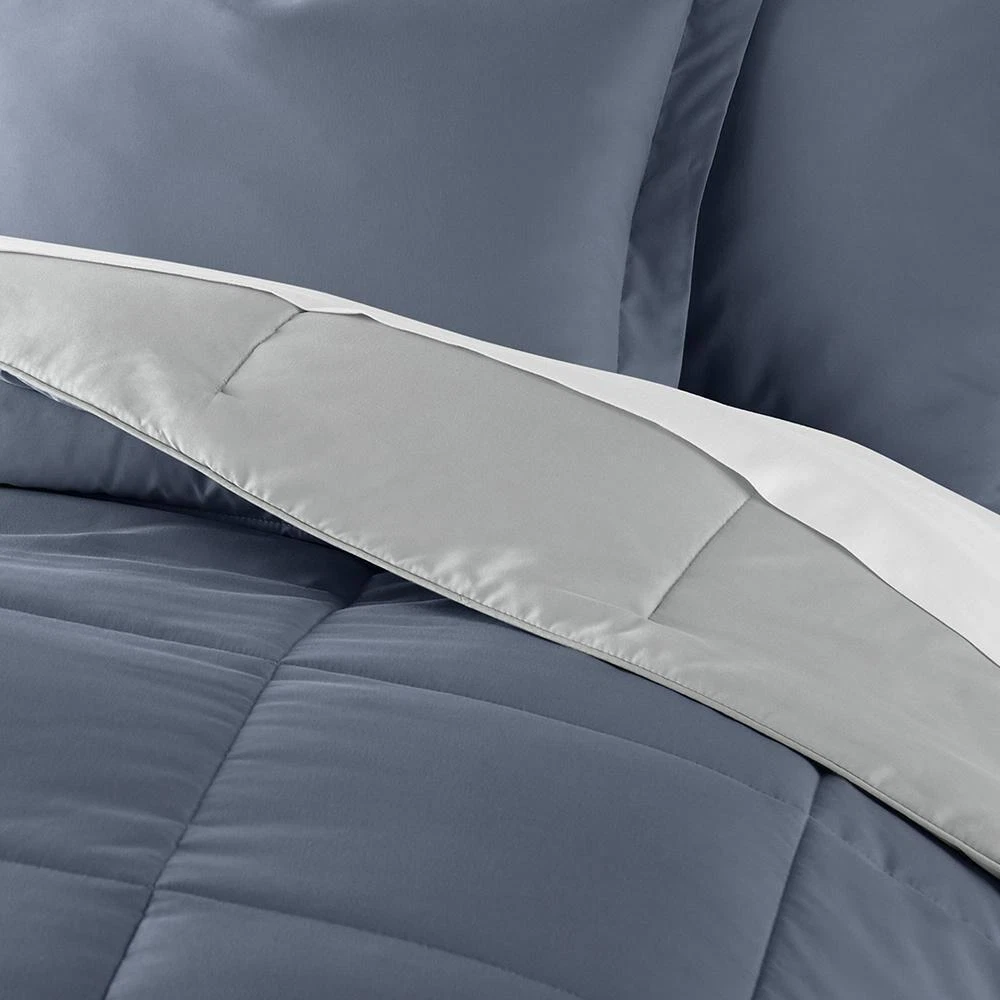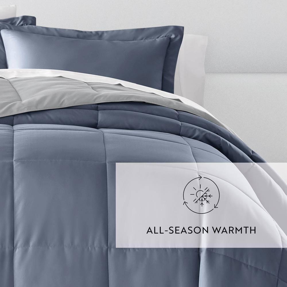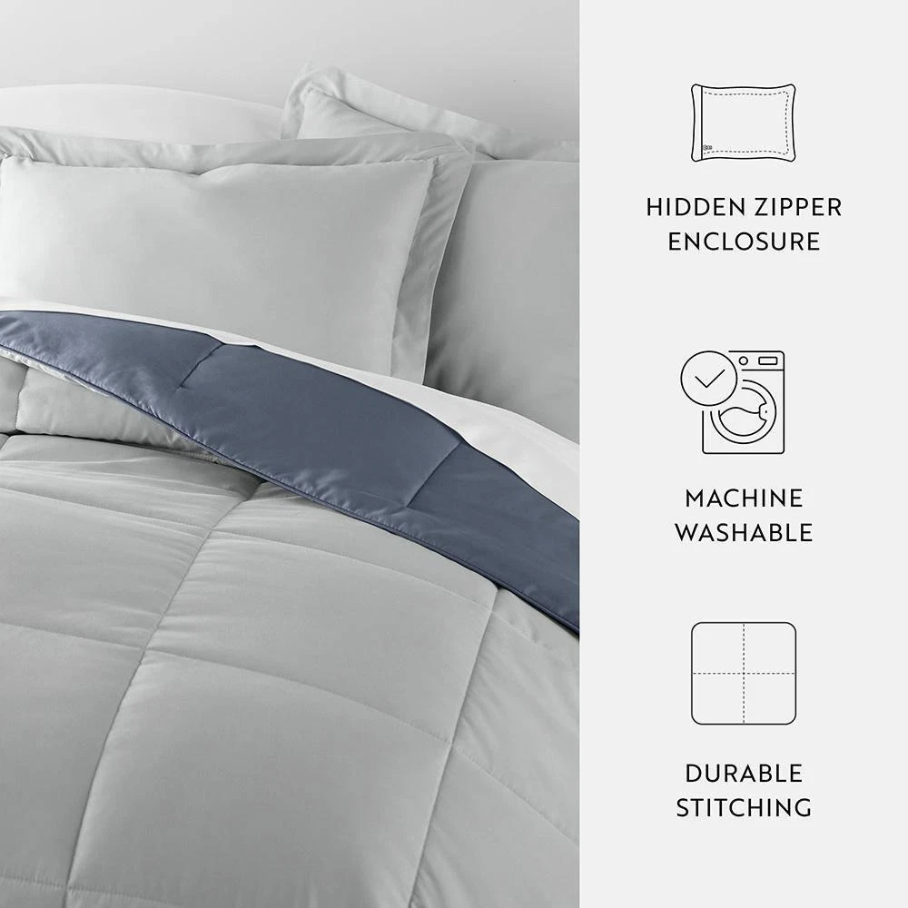 Bedding Material: Microfiber Care Instructions: Machine Wash Color: Stone / Light Gray Color Family: Blue Decor Type: Bedroom Linen Decorative Accents: No Decorative Accents Features: Reversible,Soft Fill Material: Polyester Lifestage: Adult Linen Type: Comforter Set Material: Polyester (100%) Material Family: Polyester Number of Pieces: 3 Origin: Imported Pattern Type: Solid Color Returnable : 30-Day Set Includes: Comforter,Sham Size: King/Cal King Comforter Length (in.): 96 in Comforter Width (in.): 108 in Sham Length (in.): 20 in Sham Width (in.): 36 in Give your bedding a brand new look and feel with this all season reversible down alternative comforter set. Presenting a quality alternative to down, it's incredible loft and down like feel makes it the perfect comforter to keep you cozy all year round. The end to end baffle box construction helps to eliminate the need for regular fluffing by preventing the fibers from shifting. Featuring a reversible design of aestheti call y matched colors, this set is ideal for making quick style changes to your sleep space.
