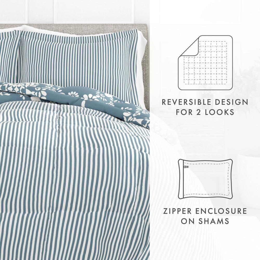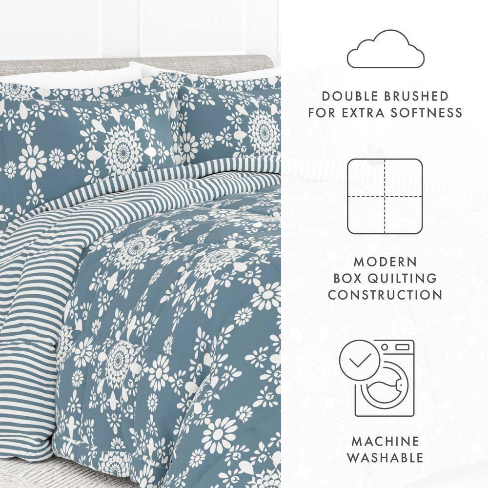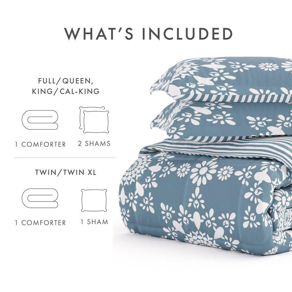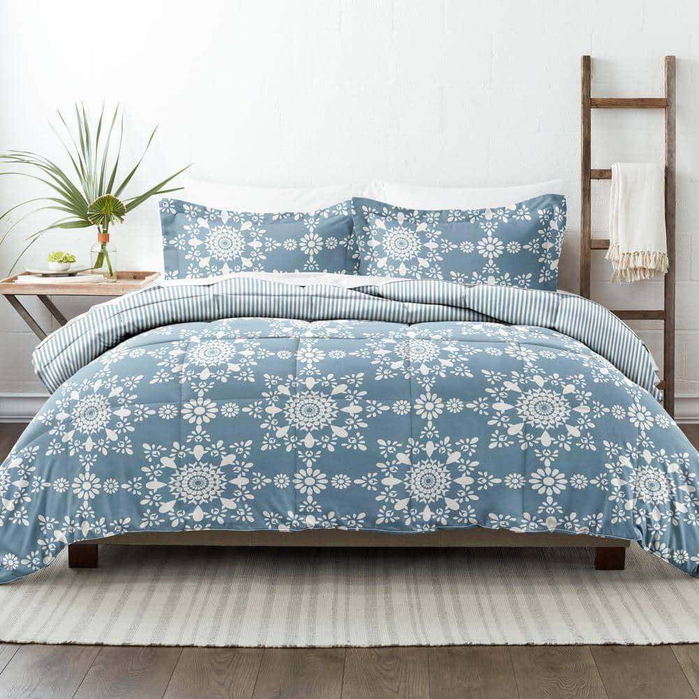 3-Piece Light Blue Daisy Medallion Pattern Reversible Microfiber Full / Queen Down-Alternative Comforter Set Soft fabric provides utmost comfort Made of polyester and microfiber to ensure durable use Reversible design offers versatile styling Give your bedding a brand new look and feel with this all season down alternative comforter set. Presenting a quality alternative to down, it's incredible loft and down like feel makes it the perfect comforter to keep you cozy all year round. The end to end baffle box construction helps to eliminate the need for regular fluffing by preventing the fibers from shifting and the set features a lovely floral design of gray magnolias. Bedding Material: Microfiber Care Instructions: Machine Wash Color: Light Blue Color Family: Blue Decor Type: Bedroom Linen Decorative Accents: No Decorative Accents Features: Hypoallergenic,Reversible,Soft Fill Material: Polyester Lifestage: Adult Linen Type: Comforter Set Material: Polyester (100%) Material Family: Microfiber Number of Pieces: 3 Origin: Imported Pattern Type: Geometric Returnable: 30-Day Set Includes: Comforter,Pillowcases Size: Full/Queen Style: Bohemian,Contemporary,Cottage,Farmhouse,Modern Thread Count: 0 Comforter Length (in.): 94 in Comforter Width (in.): 90 in Sham Length (in.): 20 in Sham Width (in.): 30 in
