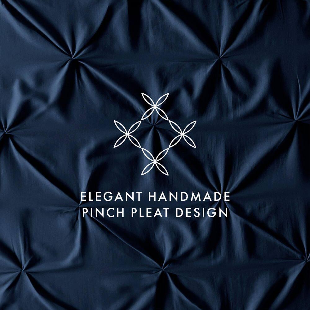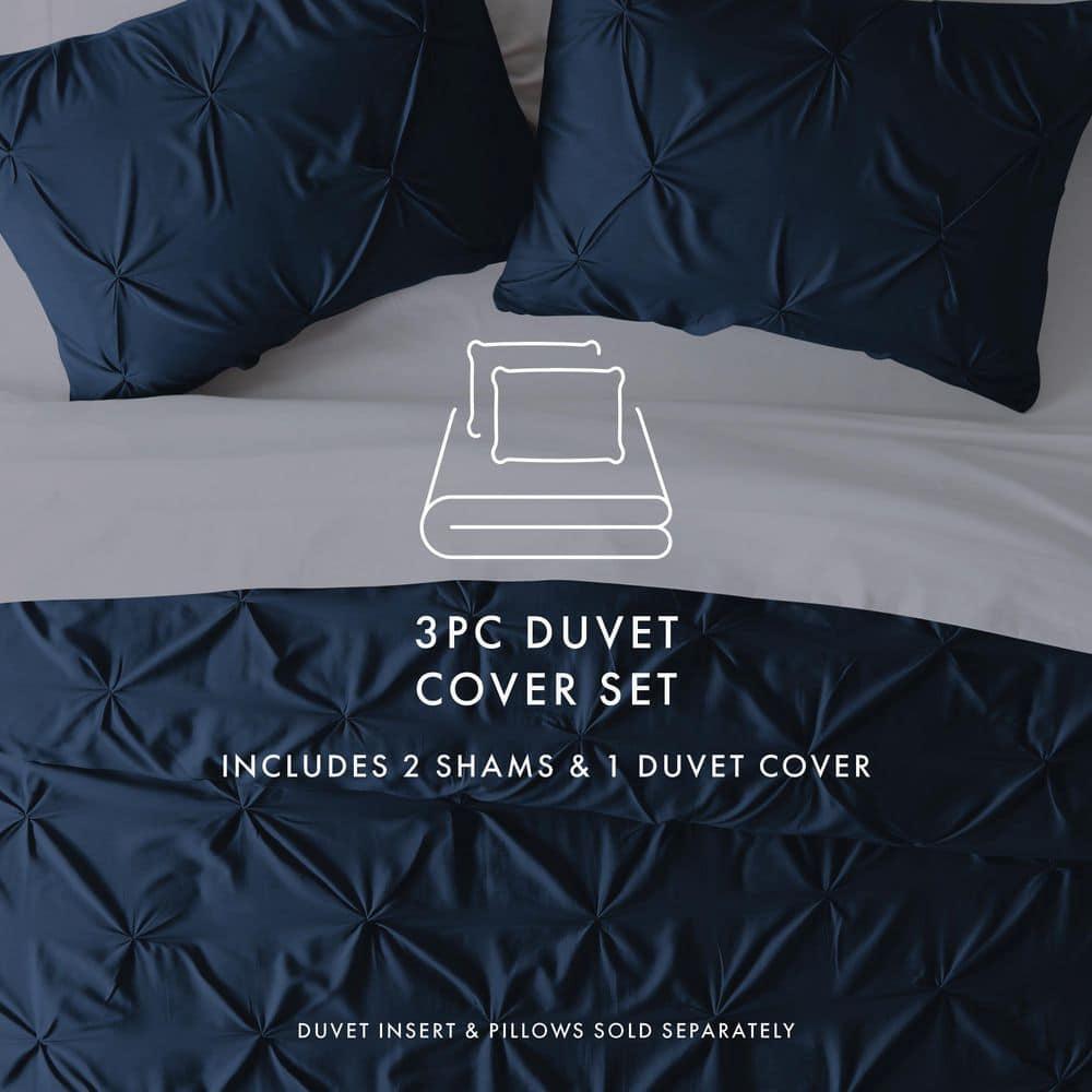 Just got this duvet cover set and I'm obsessed! The navy color is so rich and the microfiber feels incredibly soft against my skin. Love that it's reversible and the pinch pleat detailing adds such an elegant touch. Washed perfectly and didn't wrinkle at all. Makes my bedroom look like a luxury hotel!