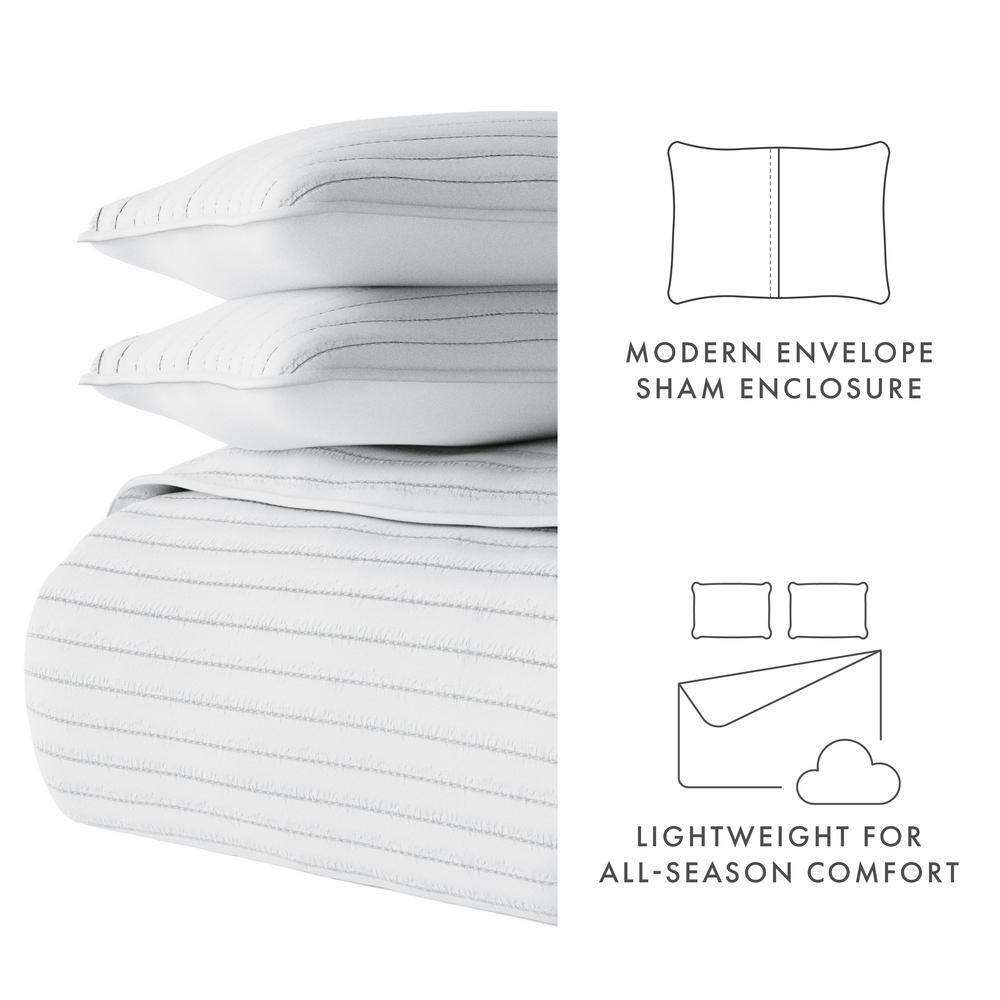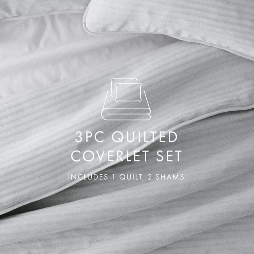 Bedding Material: Microfiber Care Instructions: Machine Wash Color: Light Gray Color Family: Gray Decor Type : Bedroom Linen Decorative Accents: No Decorative Accents Features: Soft Fill Material: Polyester Lifestage: Adult Linen Type : Quilt Set Material: Polyester (100%) Material Family: Microfiber Number of Pieces: 3 Pattern Type : Solid Color Returnable : 30-Day Set Includes: Quilt,Sham Size: Full/Queen Style : Farmhouse,Modern Quilt/Coverlet Length (in.): 94 in Quilt/Coverlet Width (in.): 90 in Sham Length (in.): 20 in Sham Width (in.): 26 in Give your room a comfy new addition with this ultra soft quilted coverlet set with shams. Spun from our premium yarns, this set is twice as strong as cotton, wrinkle resistant and double brushed for a super soft, cozy feel.