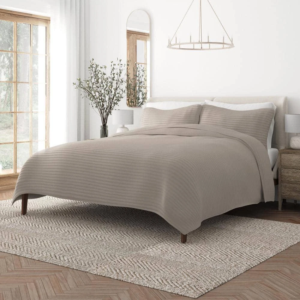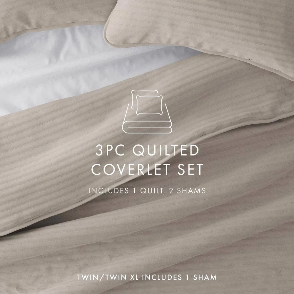 Luxuriously soft microfiber offers unparalleled comfort Premium yarns ensure double-brushed feel Machine-washable feature enables easy maintenance Give your room a comfy new addition with this ultra soft quilted coverlet set with shams. Spun from our premium yarns, this set is twice as strong as cotton, wrinkle resistant and double brushed for a super soft, cozy feel. Available in 3 elegant stitched designs of striped, floral and diamond, elevating the look and feel of any bedroom. The sets are available in 6 gorgeous colors, it'll be hard to pick only one for your bed refresh. Bedding Material: Microfiber Care Instructions: Machine Wash Color: Latte Color Family: Brown Decor Type: Bedroom Linen Decorative Accents: No Decorative Accents Features: Soft Fill Material: Polyester Lifestage: Adult Linen Type: Quilt Set Material: Polyester (100%) Material Family: Microfiber Number of Pieces: 3 Pattern Type: Solid Color Returnable : 30-Day Set Includes: Quilt,Sham Size: King/Cal King Thread Count: 0 Quilt/Coverlet Length (in.): 96 in Quilt/Coverlet Width (in.): 108 in Sham Length (in.): 20 in Sham Width (in.): 36 in