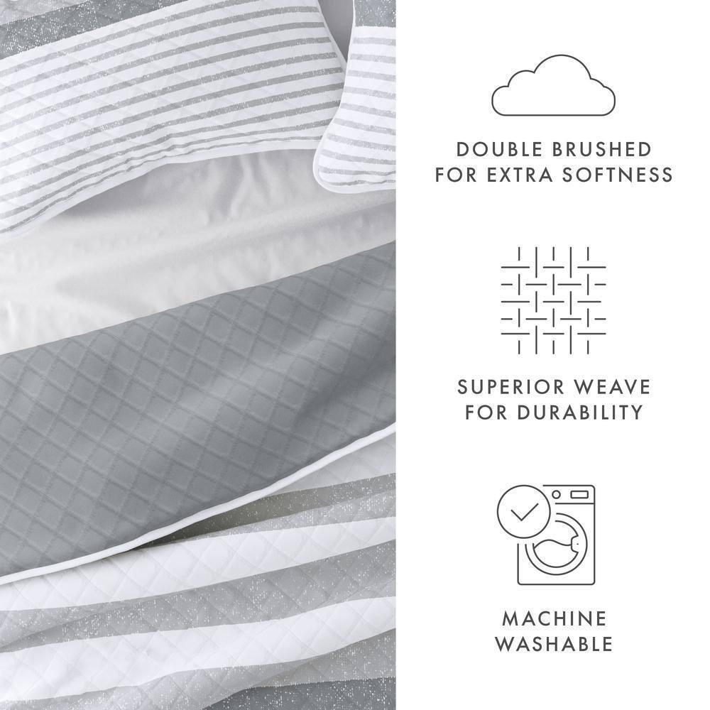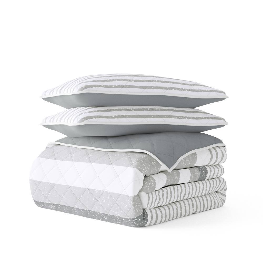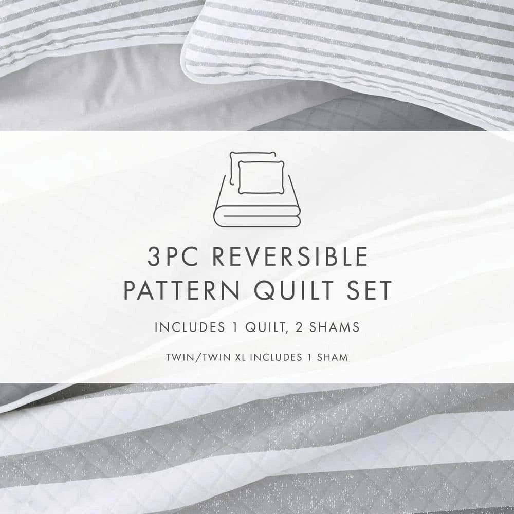 Reversible feature for versatile style Generously filled with artificial down for cozy comfort Fade- and wrinkle-resistant features ensure durability Give your room a comfy new addition with this super soft reversible microfiber quilt and sham set. This set features regatta thick and thin stripes and diamond quilting in relaxed natural colors. The beautiful, subtle quilting lines adds dimensions to the quilt, and adds a gorgeous touch to any bedroom. We've generously filled with artificial down, and each piece is double brushed to give it that super soft, cozy feel. Bedding Material: Microfiber Care Instructions: Machine Wash Color: Light Gray Color Family: Gray Decor Type: Bedroom Linen Decorative Accents: No Decorative Accents Features: Reversible,Soft Fill Material: Polyester Lifestage: Adult Linen Type: Quilt Set Material: Polyester (100%) Material Family: Microfiber Number of Pieces: 3 Pattern Type: Striped Returnable : 30-Day Set Includes: Quilt,Sham Size: King/Cal King Thread Count: 0 Quilt/Coverlet Length (in.): 96 in Quilt/Coverlet Width (in.): 108 in Sham Length (in.): 20 in Sham Width (in.): 36 in