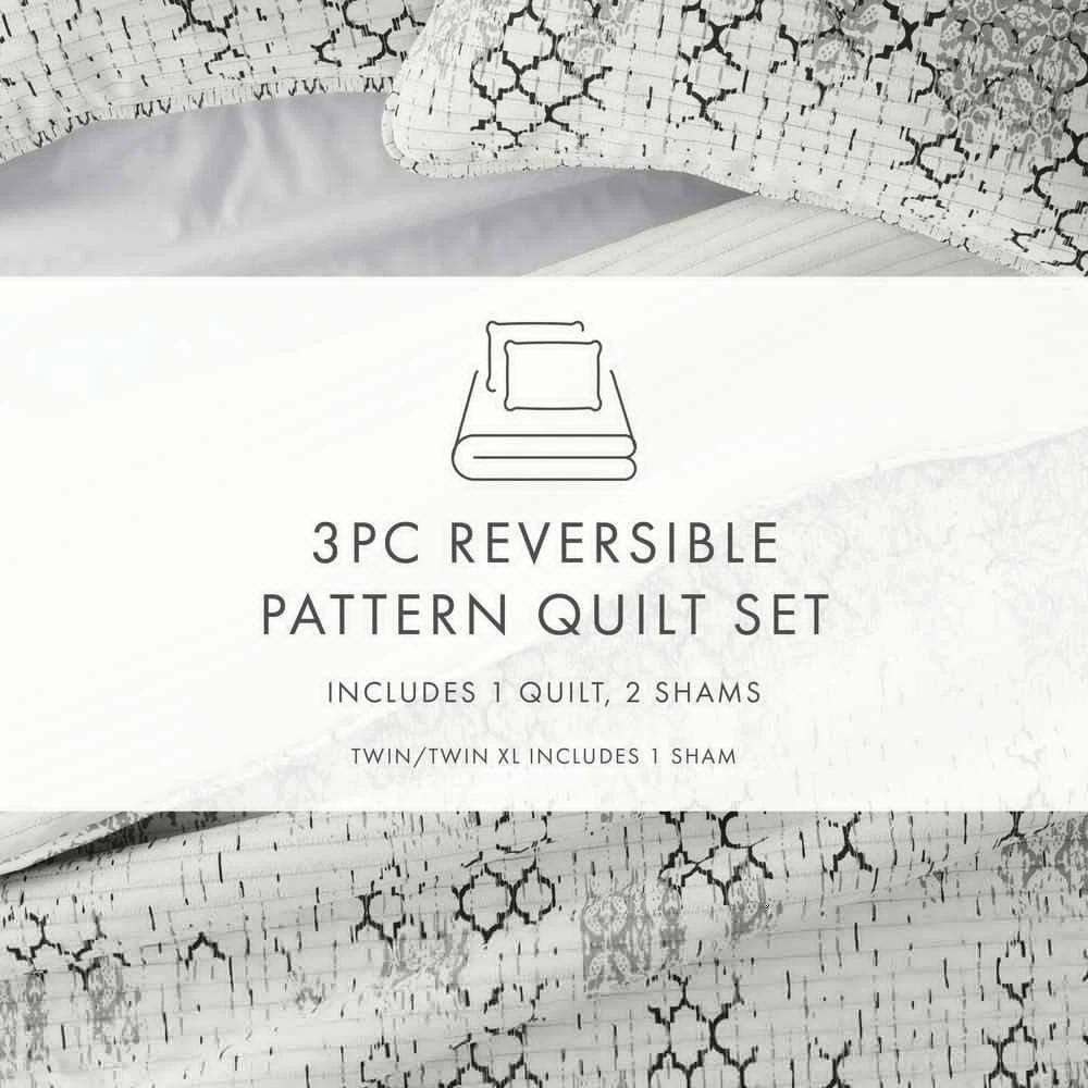Bedding Material: Microfiber Care Instructions: Machine Wash Color: Light Gray Color Family: Gray Decor Type: Bedroom Linen Decorative Accents: No Decorative Accents Features: Reversible,Soft Fill Material: Polyester Lifestage: Adult Linen Type: Quilt Set Material: Polyester (100%) Material Family: Microfiber Number of Pieces: 3 Pattern Type: Geometric Returnable : 30-Day Set Includes: Quilt,Sham Size: King/Cal King Quilt/Coverlet Length (in.): 96 in Quilt/Coverlet Width (in.): 108 in Sham Length (in.): 20 in Sham Width (in.): 36 in Give your room a comfy new addition with this super soft reversible microfiber quilt and sham set. This set features abstract, geometrical designs, and reverses to a soft ivory color. The beautiful, subtle stripe quilting lines gives the design added texture, and adds a gorgeous touch to any bedroom. We've generously filled with artificial down, and each piece is double brushed to give it that super soft, cozy feel.