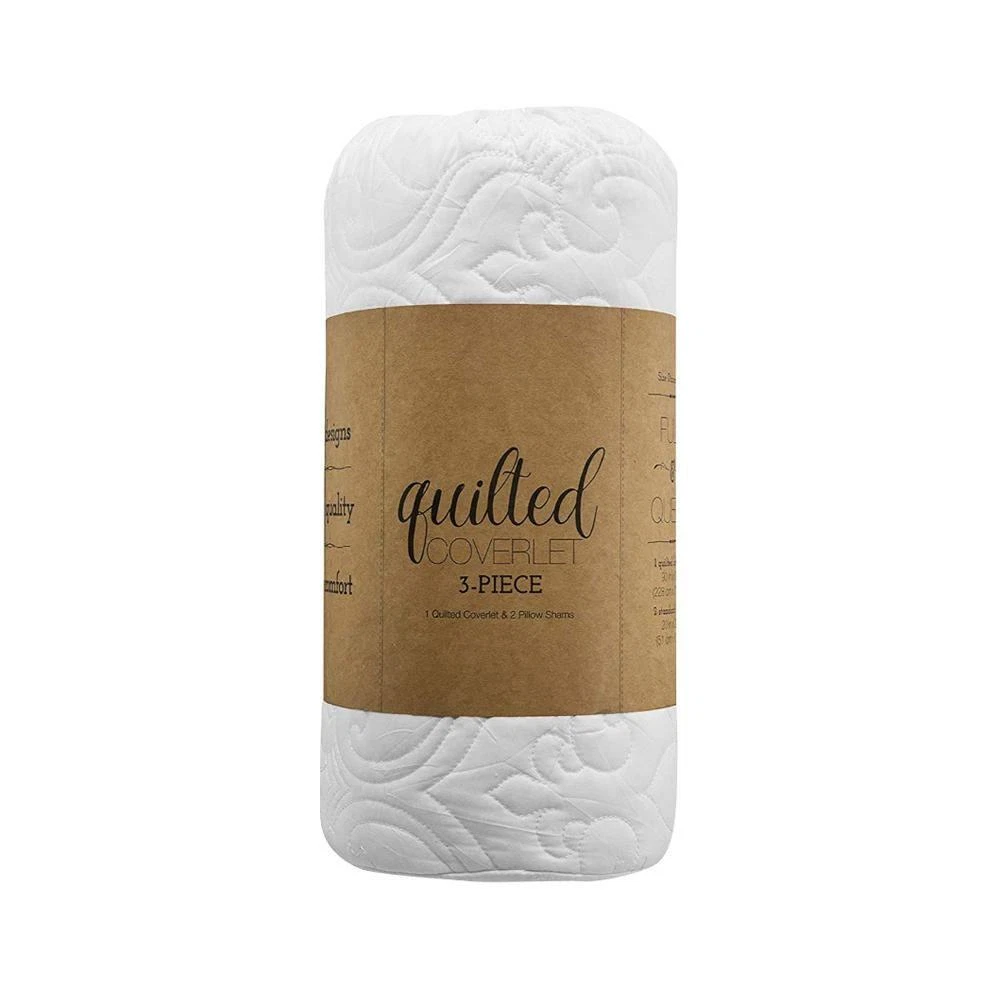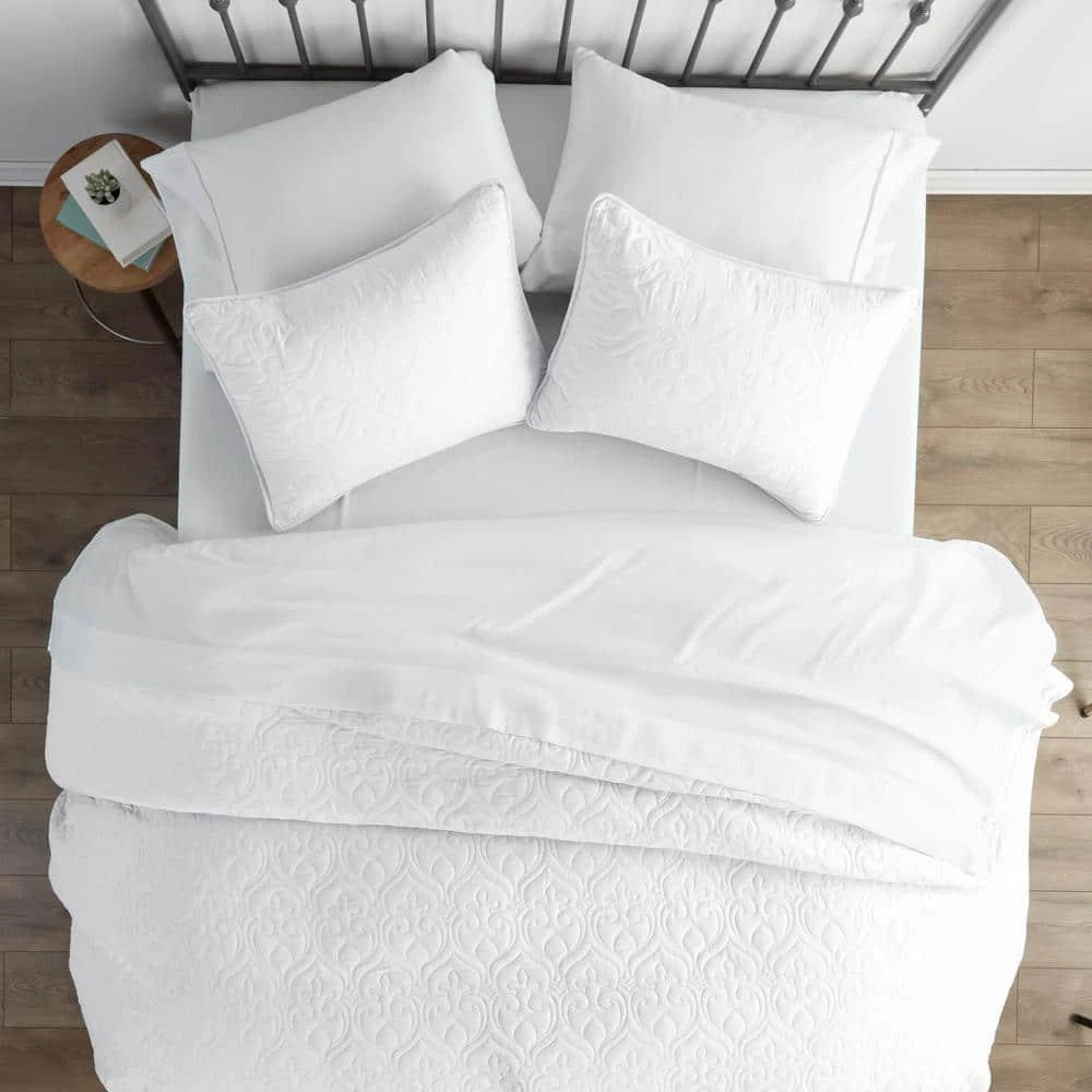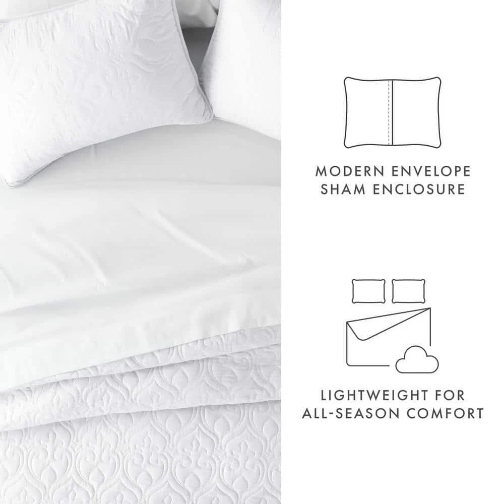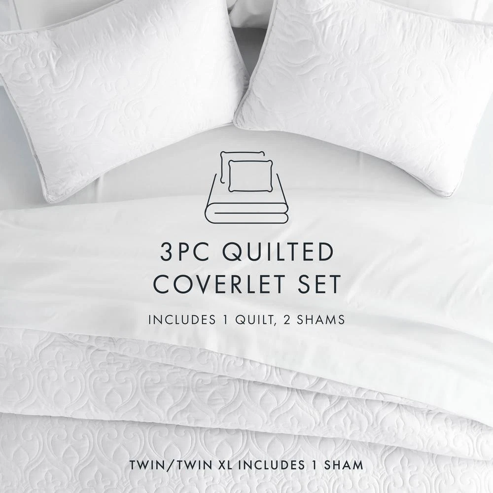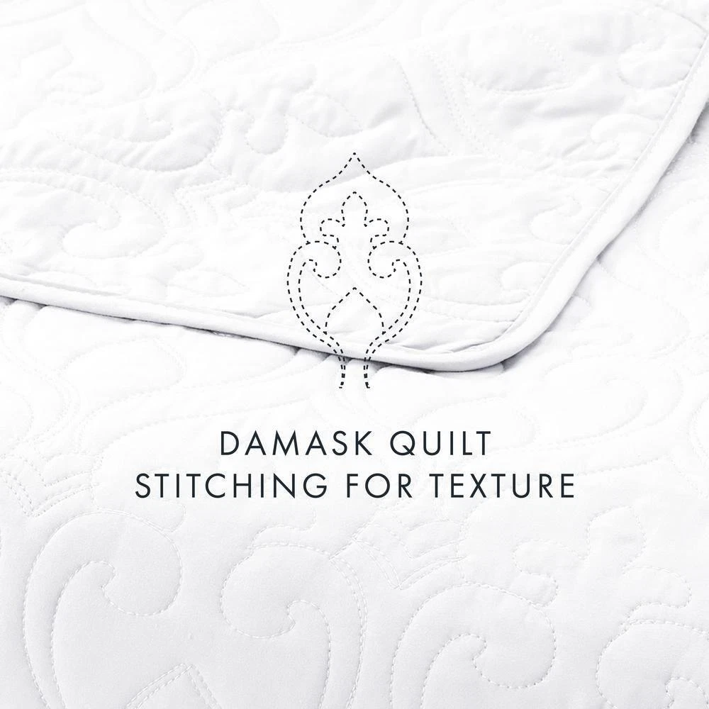 Damask White Microfiber Queen Performance Quilted Coverlet Set 1 Quilted Coverlet, 2-Shams (Tw set 1-Sham) Hypoallergenic and antimicrobial for sensitive skin Double Brushed Microfiber for comfort and temperature control The Becky Cameron Quilted Coverlet is where casual elegance meets pure uncompromising comfort. Sure to compliment any bedroom style, this beautiful coverlet is available in three timeless patterns. Spun from our premium microfiber yarns, offering twice the durability of cotton and is 100% hypoallergenic. Truly an All Seasons Coverlet, it will keep you warm in the winter and cool in the summer and is sure to add the finishing touch to your tranquil bedroom oasis. Bedding Material: Microfiber Care Instructions: Machine Wash Color: White Color Family: White Decor Type: Bedroom Linen Decorative Accents: No Decorative Accents Features: Hypoallergenic Fill Material: Polyester Lifestage: Adult Linen Type: Coverlet Set Material: Polyester (100%) Material Family: Microfiber Number of Pieces: 3 Origin: Imported Pattern Type: Geometric Returnable: 30-Day Set : Coverlet,Sham Size: Queen Style: Classic Thread Count: 0 Quilt/Coverlet Length (in.): 94 in Quilt/Coverlet Width (in.): 90 in Sham Length (in.): 20 in Sham Width (in.): 26 in