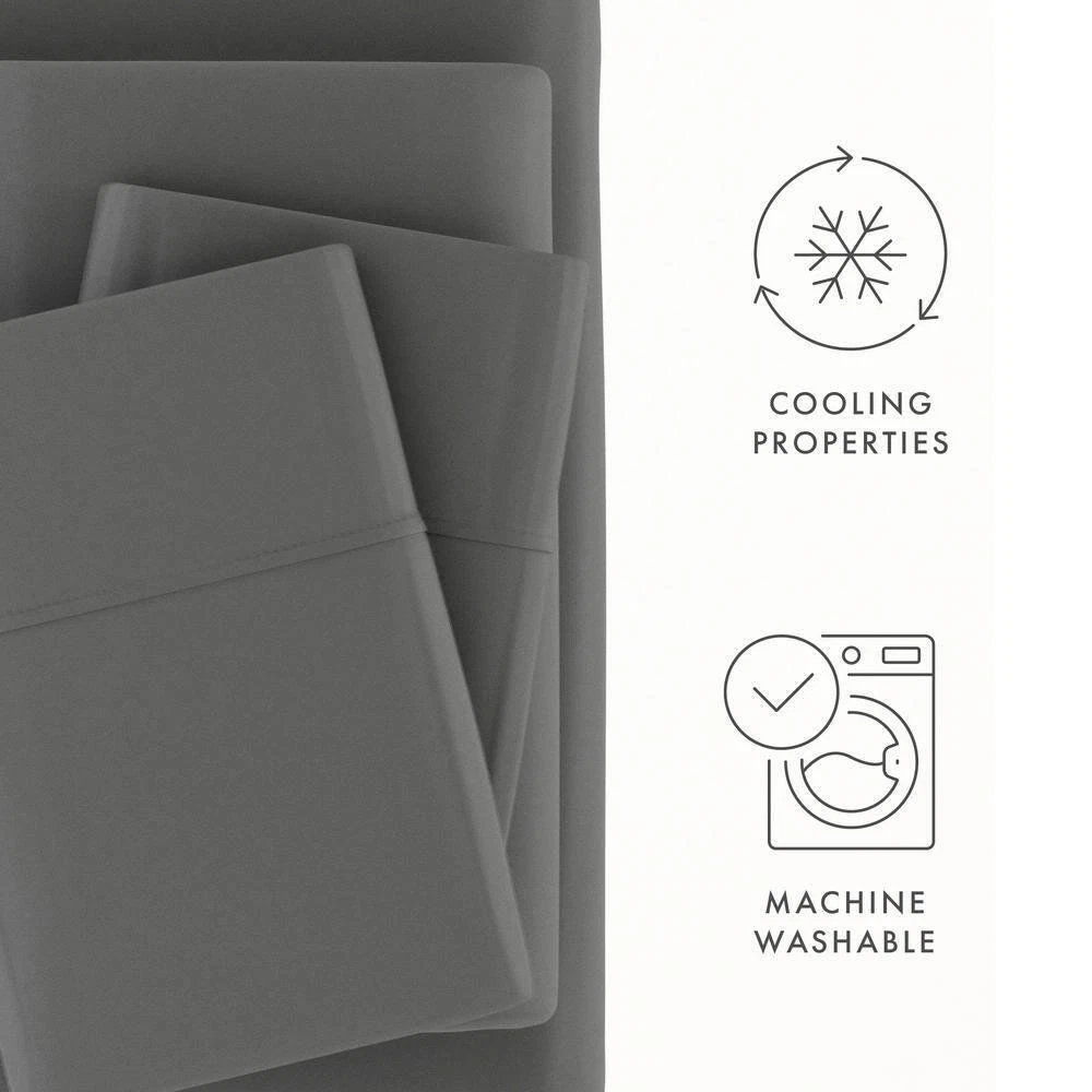 1-Flat, 1-Fitted, 2-Pcases (TW sets 1-Pcase) 14 in. Deep-Pocket Fitted Sheets The Becky Cameron Sheet Set is the ultimate bedding on the market today. These sheets create a softness unlike you have ever felt before. Satin smoothness and expertly crafted breathability wicks away any sweat or moisture, keeping you dry and comfortable all-night long. You will absolutely love this bedding! We pride ourselves on the high quality of our sheets because we consider your comfort of absolute importance to us. Bedding Material: Rayon Care Instructions: Machine Wash Color: Gray Color Family: Gray Decor Type: Bedroom Linen Features: Antimicrobial,Deep Pocket,Hypoallergenic Lifestage: Adult Linen Type: Sheet Set Material: Rayon (100%) Number of Pieces: 4 Occasion: Year Round Origin: Imported Pattern Type: Solid Color Pattern/theme: Solid Pocket Depth (in.): 16 in. Returnable : 30-Day Set : Fitted Sheet,Flat Sheet,Pillow cases Size: Twin Thread Count: 300