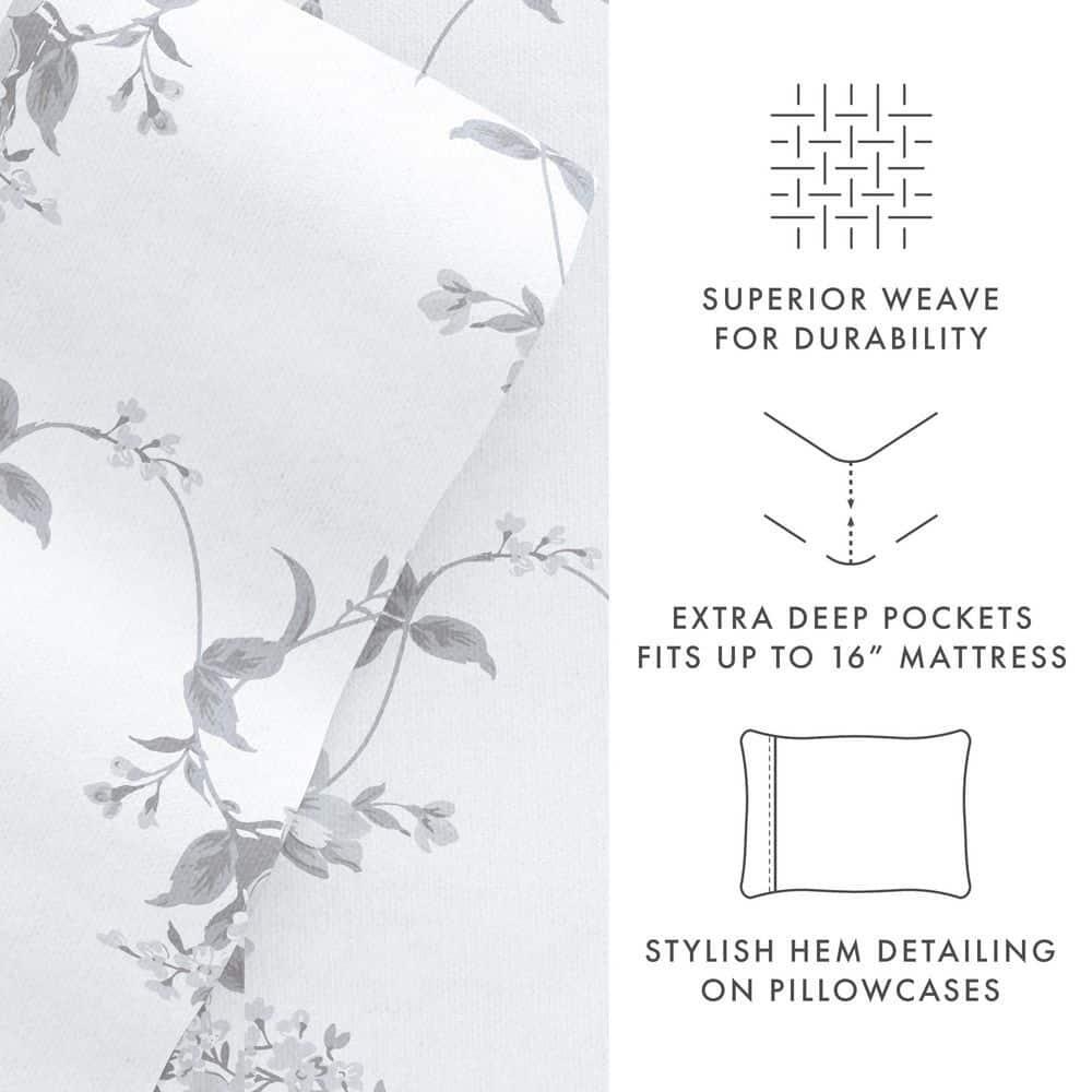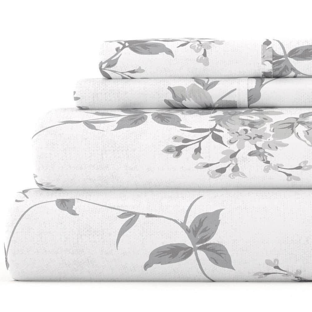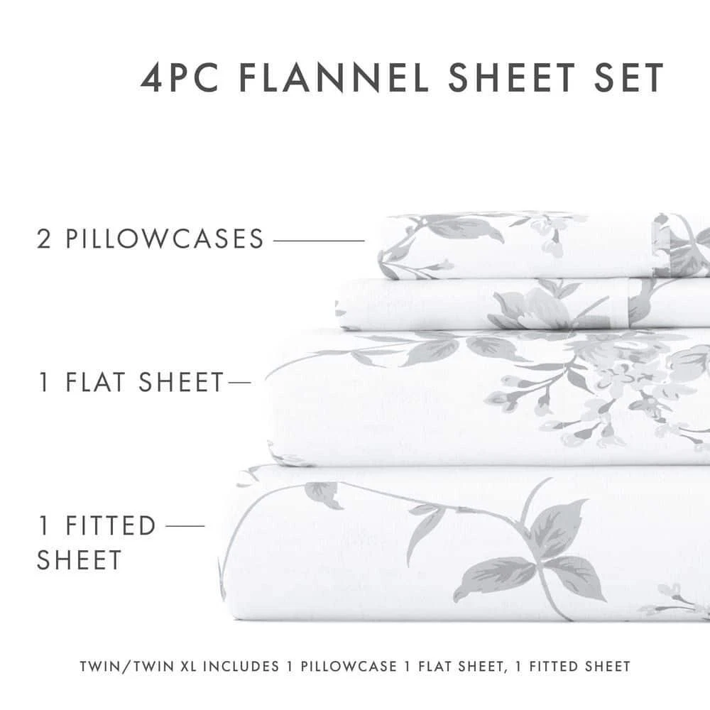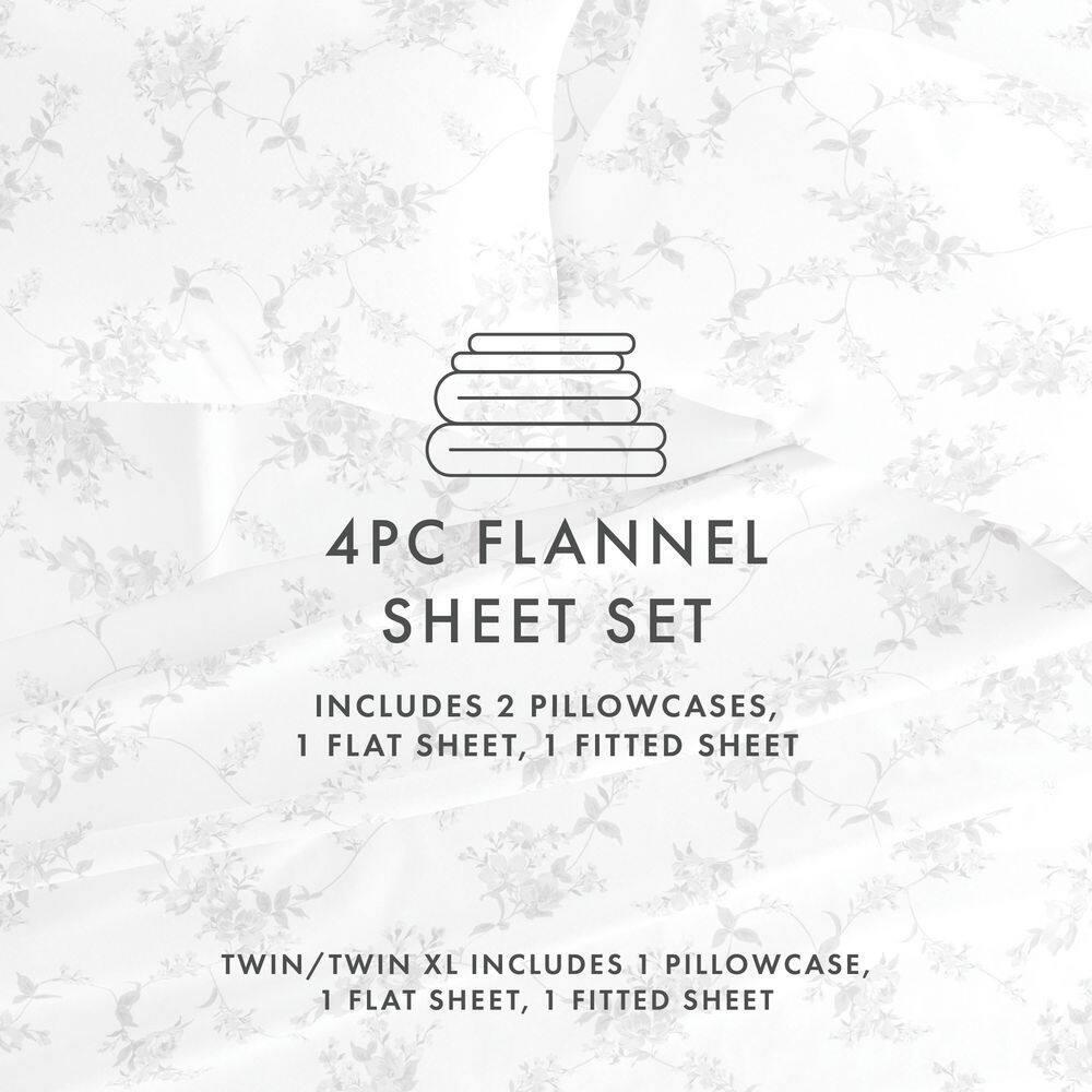 4-piece set a flat sheet, fitted sheet, and pillowcases Made of ultra-soft 100% cotton for comfort 14 in. deep pocket fitted sheets enable easy use and a snug fit Add a pop of color and warmth to your bedroom decor with this stylish Sylvan Rose flannel sheet set. These sheets are finely crafted of 100% cotton. The ultimate softness and dense fabric is specifi call y designed to keep you snuggled up and cozy all night long. Bedding Material: Flannel Care Instructions: Machine Wash Color: Gray Color Family: Gray Decor Type: Bedroom Linen Features: Deep Pocket,Hypoallergenic,Machine Washable,Soft Lifestage: Adult Linen Type: Sheet Set Material: Cotton (100%) Number of Pieces: 4 Occasion: Year Round Origin: Imported Pattern Type: Floral Pattern/theme: Print Pocket Depth (in.): 14 in. Returnable : 30-Day Set : Fitted Sheet,Flat Sheet,Pillow cases Size: King Thread Count: 82