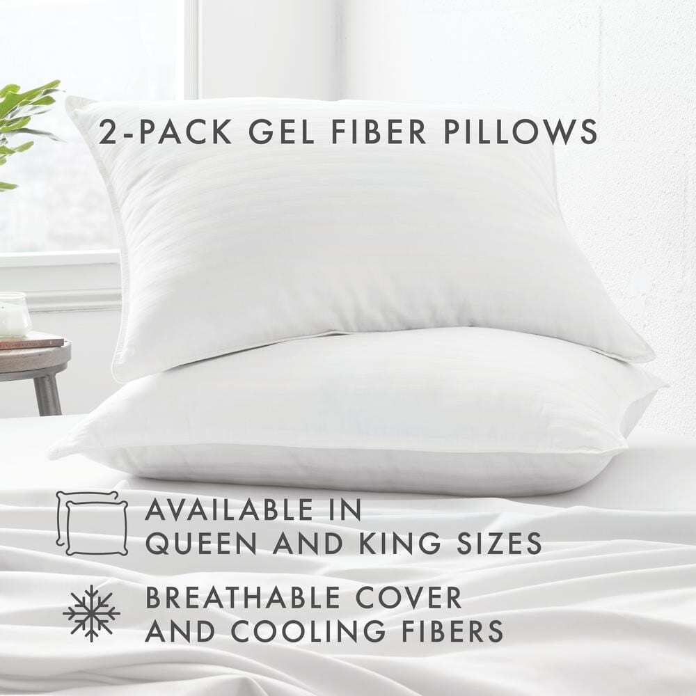 Stain-resistant material offers easy maintenance 100% cotton cover ensures longevity Soft gel-infused fibers provide relaxed sleep Experience a better night sleep with our plush down alternative gel-fiber 2-pack pillows. Made with 100% cotton cover and luxury cooling gel-infused fibers to keep you comfortable all night long. Non-toxic and perfect for back, side and stomach sleepers, these pillows are the optimal place to rest your head. Bedding Type: Sleeping Pillow Color: White Color Family: White Comfort Level: Plush Cover Material: Cotton Decor Type: Bedroom Linen Features: Cooling,Hypoallergenic,Stain Resistant Fill Material: Polyfiber Material: Cotton (15%), Polyester (85%) Number of Pieces: 2 Origin: Imported Pillow Shape: Rectangle Pillow Size: Queen Quantity: 2 Returnable: 30-Day Sleep Position: Combination Product Length (in.): 28 in Product Width (in.): 20 in