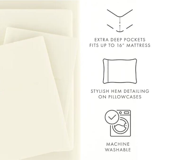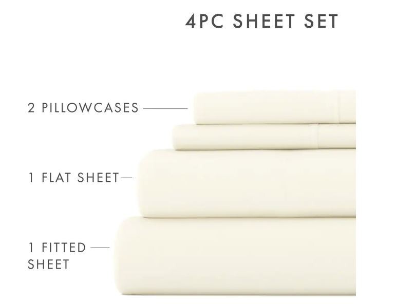 Details: Update your bedroom with this 4-piece bed sheet set. This set includes pillowcases, a flat sheet, and a fitted sheet to cover your basic bedding needs. Fade- and wrinkle-resistant microfiber stays fresh-looking year-round, offering a luxuriously soft, antimicrobial, and hypoallergenic option for your family. Features: Includes 1 flat sheet, 1 fitted sheet, and 2 pillowcases (1 in Twin/Twin XL) Made of plush, breathable microfiber polyester 90 GSM 16-inch deep pocket fitted sheets Machine washable (cold cycle; tumble dry low) Fade-resistant, wrinkle-free design Superior weave for durability and buttery soft touch Hypoallergenic/antimicrobial material Full Dimensions: Fitted sheet: 54 inches wide x 75 inches long + 16-inch pocket depth Flat sheet: 81 inches wide x 96 inches long Standard pillowcases: 20 inches wide x 30 inches long