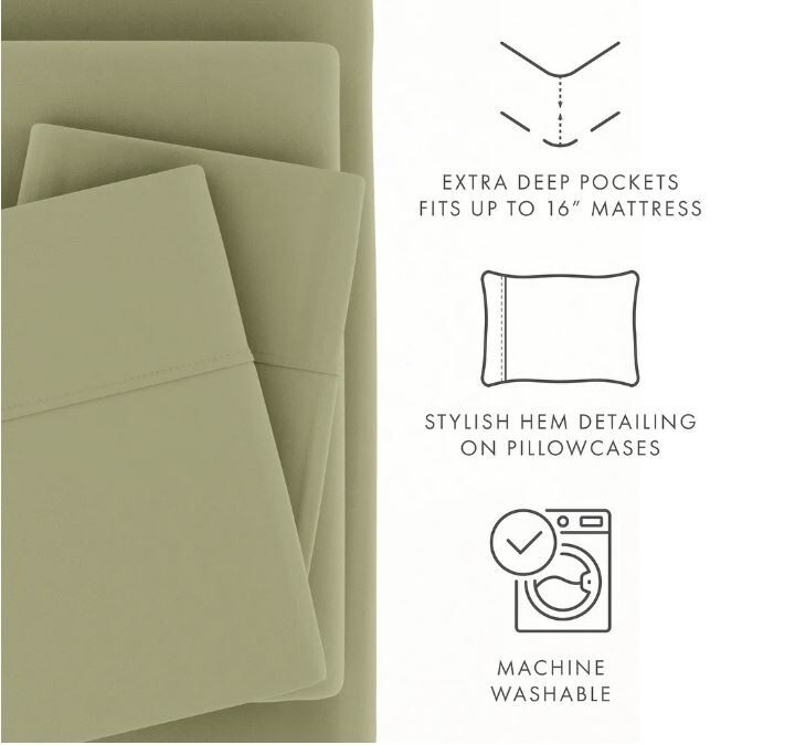 Details: Update your bedroom with this 4-piece bed sheet set. This set includes pillowcases, a flat sheet, and a fitted sheet to cover your basic bedding needs. Fade- and wrinkle-resistant microfiber stays fresh-looking year-round, offering a luxuriously soft, antimicrobial, and hypoallergenic option for your family. Features: Includes 1 flat sheet, 1 fitted sheet, and 2 pillowcases (1 in Twin/Twin XL) Made of plush, breathable microfiber polyester 90 GSM 16-inch deep pocket fitted sheets Machine washable (cold cycle; tumble dry low) Fade-resistant, wrinkle-free design Superior weave for durability and buttery soft touch Hypoallergenic/antimicrobial material Full Dimensions: Fitted sheet: 54 inches wide x 75 inches long + 16-inch pocket depth Flat sheet: 81 inches wide x 96 inches long Standard pillowcases: 20 inches wide x 30 inches long