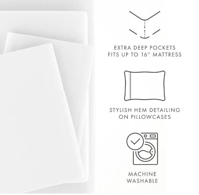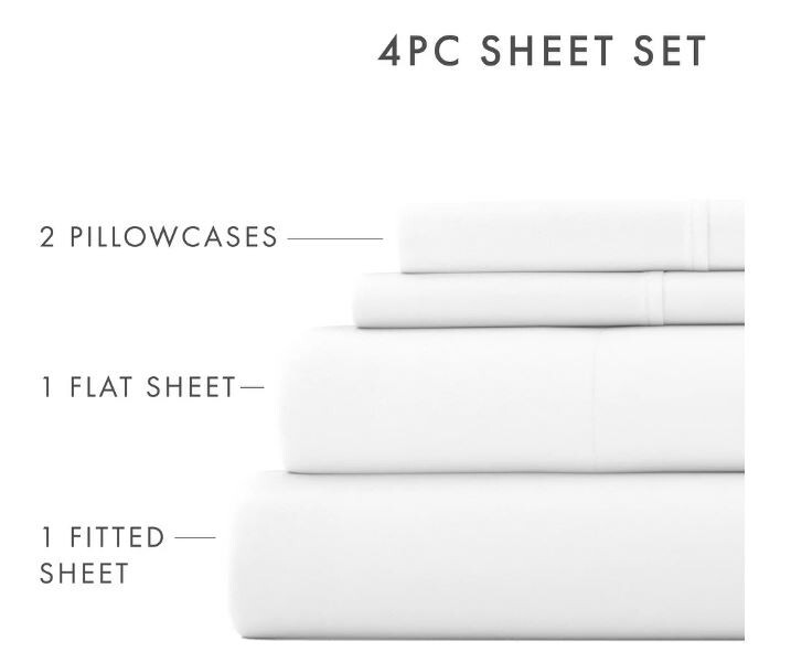 Details: Update your bedroom with this 4-piece bed sheet set. This set includes pillowcases, a flat sheet, and a fitted sheet to cover your basic bedding needs. Fade- and wrinkle-resistant microfiber stays fresh-looking year-round, offering a luxuriously soft, antimicrobial, and hypoallergenic option for your family. Features: Includes 1 flat sheet, 1 fitted sheet, and 2 pillowcases (1 in Twin/Twin XL) Made of plush, breathable microfiber polyester 90 GSM 16-inch deep pocket fitted sheets Machine washable (cold cycle; tumble dry low) Fade-resistant, wrinkle-free design Superior weave for durability and buttery soft touch Hypoallergenic/antimicrobial material Full Dimensions: Fitted sheet: 54 inches wide x 75 inches long + 16-inch pocket depth Flat sheet: 81 inches wide x 96 inches long Standard pillowcases: 20 inches wide x 30 inches long