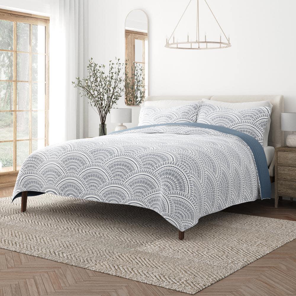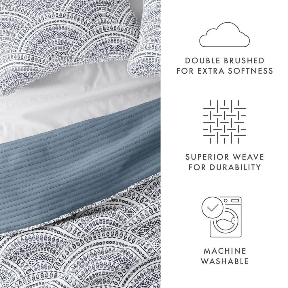 All Season 3-Pcs Scallop Reversible Microfiber Quilt Set with Shams Reversible design enhances bedroom aesthetics Generously filled for a plush and cozy sleeping experience Resists fading and wrinkles to offer enduring beauty Give your room a comfy new addition with this super soft reversible microfiber quilt and sham set. This set features a playful geometrics and lines come together to create this whimisical scalloped design, reversing to a co-ordinating solid on the back side. The beautiful, subtle straight quilting lines adds dimensions to the quilt, and adds a gorgeous touch to any bedroom. We've generously filled with artificial down, and each piece is double brushed to give it that super soft, cozy feel. Bedding Material: Microfiber Care Instructions: Machine Wash Color: Dusk Blue Color Family: Blue Decor Type: Bedroom Linen Decorative Accents: No Decorative Accents Features: Reversible,Soft Fill Material: Polyester Lifestage: Adult Linen Type: Quilt Set Material: Polyester (100%) Material Family: Microfiber Number of Pieces: 3 Pattern Type: Geometric Returnable: 30-Day Set : Quilt,Sham Size: Full/Queen Style: Farmhouse,Modern Thread Count: 0 Quilt/Coverlet Length (in.): 94 in Quilt/Coverlet Width (in.): 90 in Sham Length (in.): 20 in Sham Width (in.): 26 in