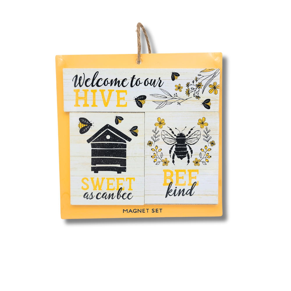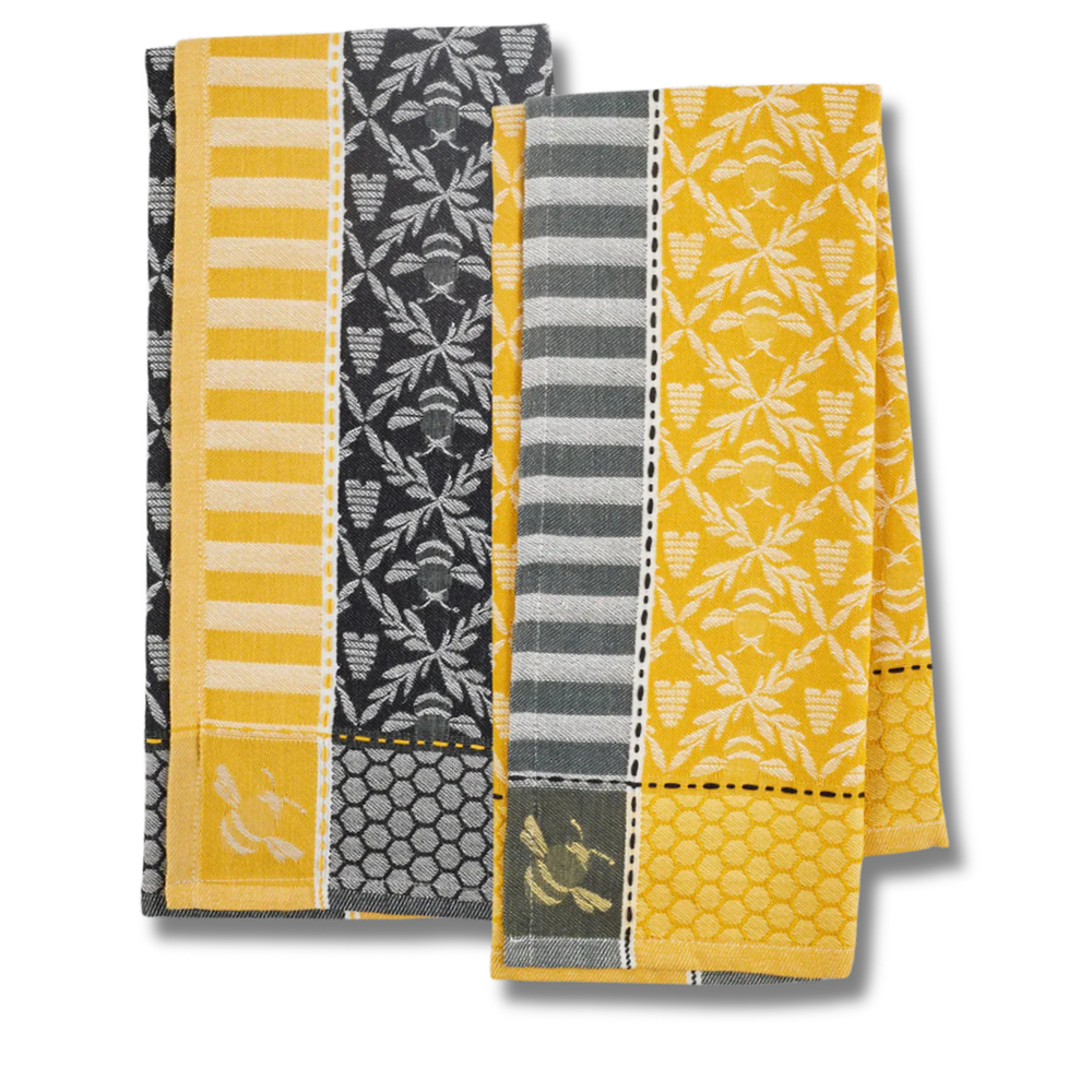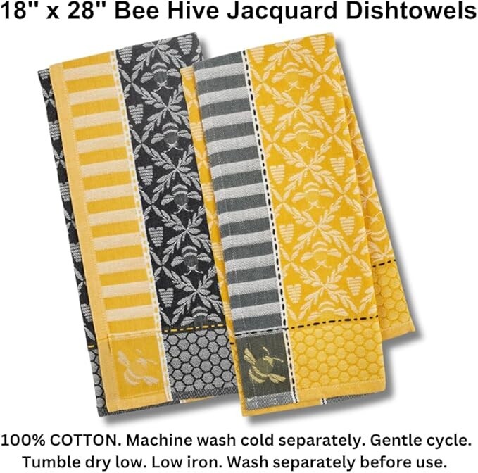 Bee Hive Jacquard Dishtowels & Refrigerator Magnets Set Honey Bee Kitchen Decor This adorable kitchen decor set brings a sweet touch of honey bees to your space. The large 18" x 28" cotton jacquard dish towels feature a honeycomb pattern with cute bees and hives, keeping your counters protected in a cheerful print. Includes a set of 3 refrigerator magnets featuring bees and cute sayings. Great for the baker, gardener or anyone wanting to bring the charm of bees into their kitchen in a low-maintenance way. Soft Absorbent Towels: 100% cotton jacquard dish towels quickly soak up water and are very durable for daily kitchen use. Large 18" x 28" towels feature honeycomb and bee pattern Neutral/warm gray and gold colors bring style to your kitchen Includes set of 2 Dishtowels and set of 3 Magnets that feature bees and cute sayings