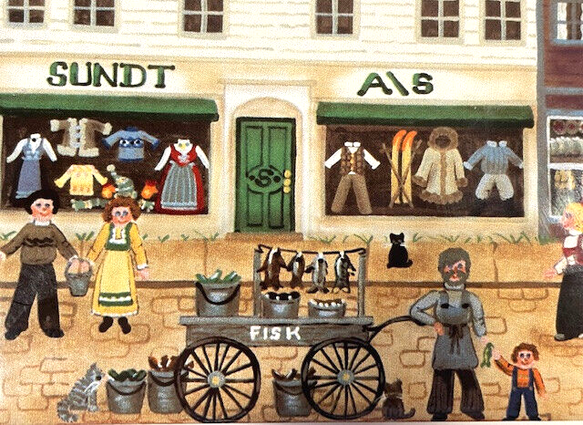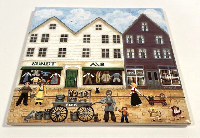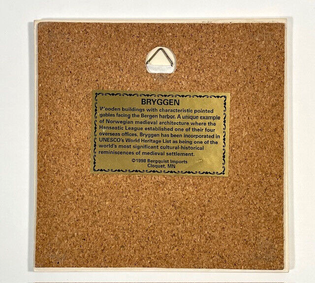 The Bergquist Imports Bryggen Tile is a medium-sized ceramic square tile from 1998 featuring a cultural scene of Norwegian buildings in a multicolor palette. Measuring 6 inches in length and width with a thickness of 0.25 inches, it is suitable for wall decor or use as a trivet. This vintage Scandinavian/Nordic piece has a glazed finish, cork back, and wall hook for easy hanging, making it a charming addition to any room.