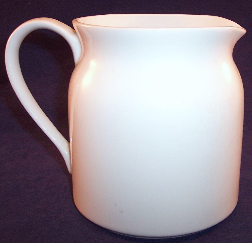 PLEASE READ CONDITION NOTES IN RED BELOW! Bergquist Imports 1 qt. pitcher White with a Swedish or Scandinavian red and blue flower design on the front Pitcher stands 5-3/8" tall and measures about 4-1/4" across the rim Bergquist Imports mark on the bottom Condition : Outside, the pitcher is in very good condition with no chips or cracks. Inside, there is a light colored residue ring of some kind on the bottom. There may be a way to get it off but it seems to be pretty much fused to the bottom. See the third and fourth photos above (with and without flash). The price has been reduced accordingly. The floral motif on the outside is in perfect condition! This charming little pitcher would make a great replacement piece or addition to your kitchen table! Please e-mail me with any questions ***This item cannot be shipped with other items***