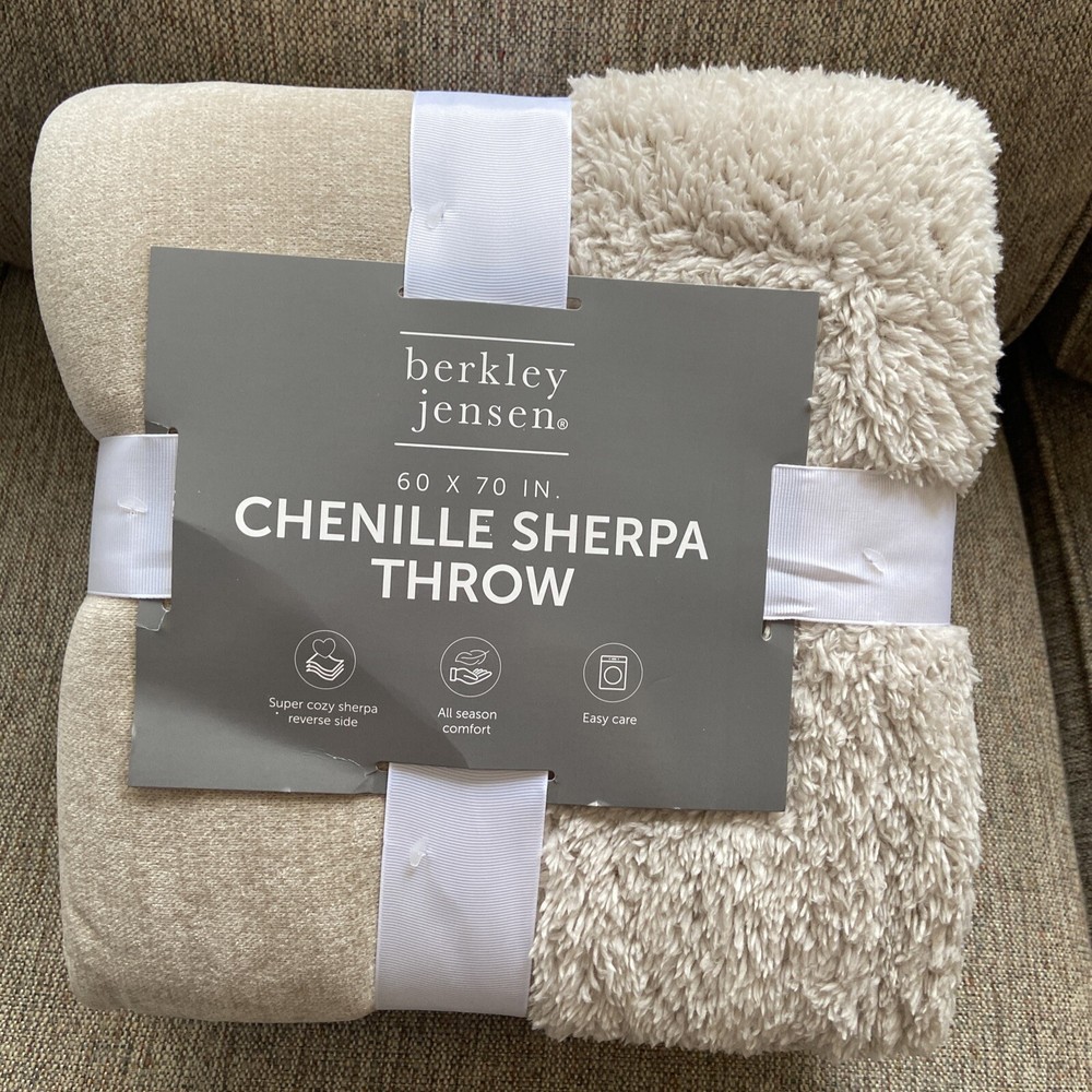 Berkley Jensen Chenille Sherpa Throw 60”x70” Inches Super Cozy Sherpa Beige.Condition is New with tags. Shipped with USPS Ground Advantage. I have one more in this color if you want just message me ,i can bundle of two