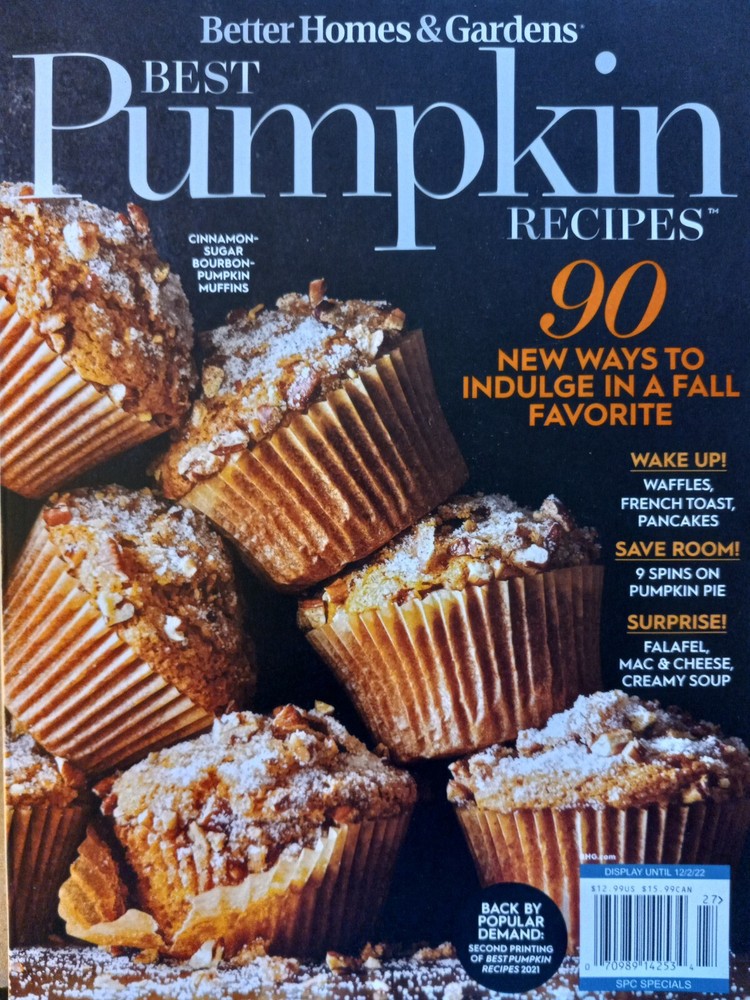 Best Pumpkin Recipes Better Homes & Garden Magazine. To see table of contents please see pictures. Shipped with media mail. **These Magazines are new as in never owned before. They are magazines I recieve that didn't sell off the retail shelves. They are in great condition. Not perfect. Some are perfect. I don't list these as collector items. If you would like a picture of the copy you recieve I can send pictures upon request. I ship all of my magazines with cardboard to ensure no damage from post office. When you open the envelope, the side with the address has the cardboard and safe to cut open on that side. Please take a look at seller's other magazine's 😊
