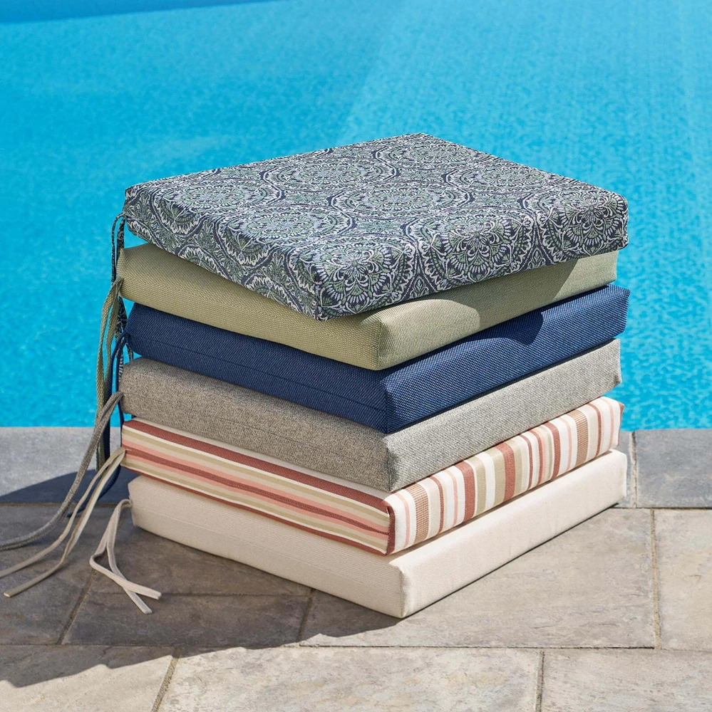 Our premium seat replacement cushion features a durable foam core to add comfort, support, and style to outdoor furniture. The fade resistant 100% solution dyed polyester fabric is treated with 3M Scotchgard™ to resist fading, water, and stains. Designed to fit most dining chairs. This 1-piece set includes 1 seat cushion. 1-Piece Cushion: 19" L x 18" W x 3.5" H 3M Scotchgard™ treated fabric resists water and stains Superior fade resistant 100% solution dyed polyester fabric Premium cushion with durable foam core adds extra support and comfort Equipped with ties to keep cushion in place Clean fabric with mild soap and water and air dry After unpacking, allow 24-48 hours for vacuum-packed cushion to fully expand