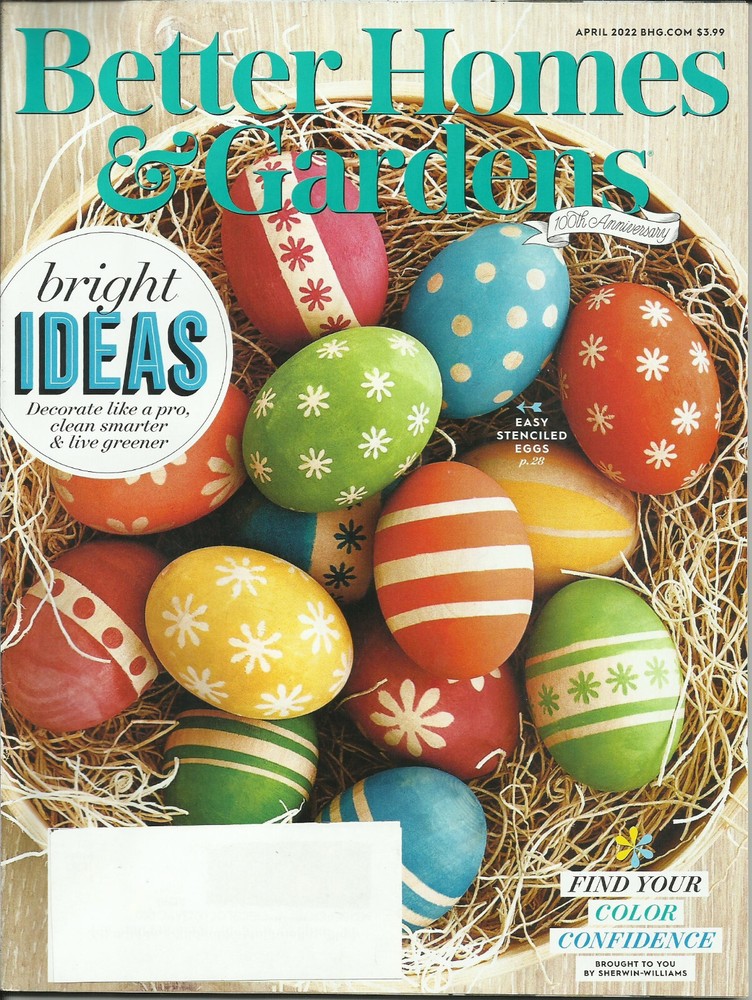 April 2022 100th Anniversary Issue of Better Homes And Gardens Magazine. Articles of interest: -Bright Ideas | Decorate Like A Pro, Clean Smarter & Live Greener -Easy Stenciled Eggs, P.28 -Find Your Color Confidence Mailing label will be covered by a blank white label. Image is a scan of the actual cover. Free Shipping!