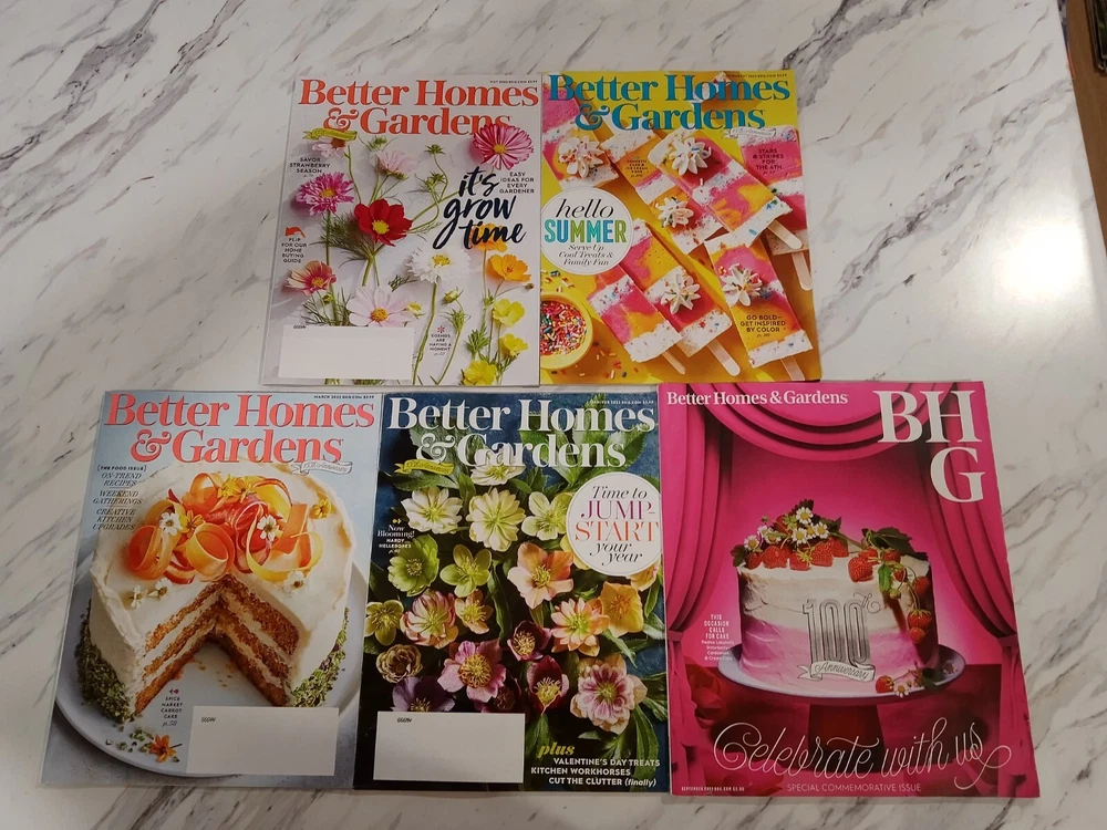 Better Homes And Gardens (BH&G) 25th Anniversary 5 Magazine Lot: January/Febuary 2022 - Jump Start Your Year March 2022 - "The Food Issue" - Carrot Cake Recipes May 2022 - It’s Grow Time July/August 2022 - Hello Summer! September 2022 - 100th Anniversary Commemorative Issue