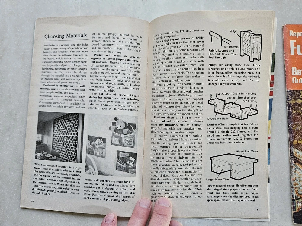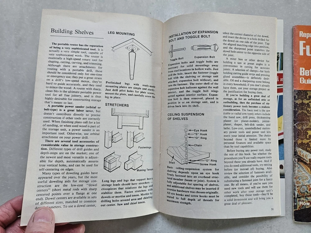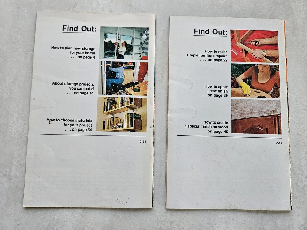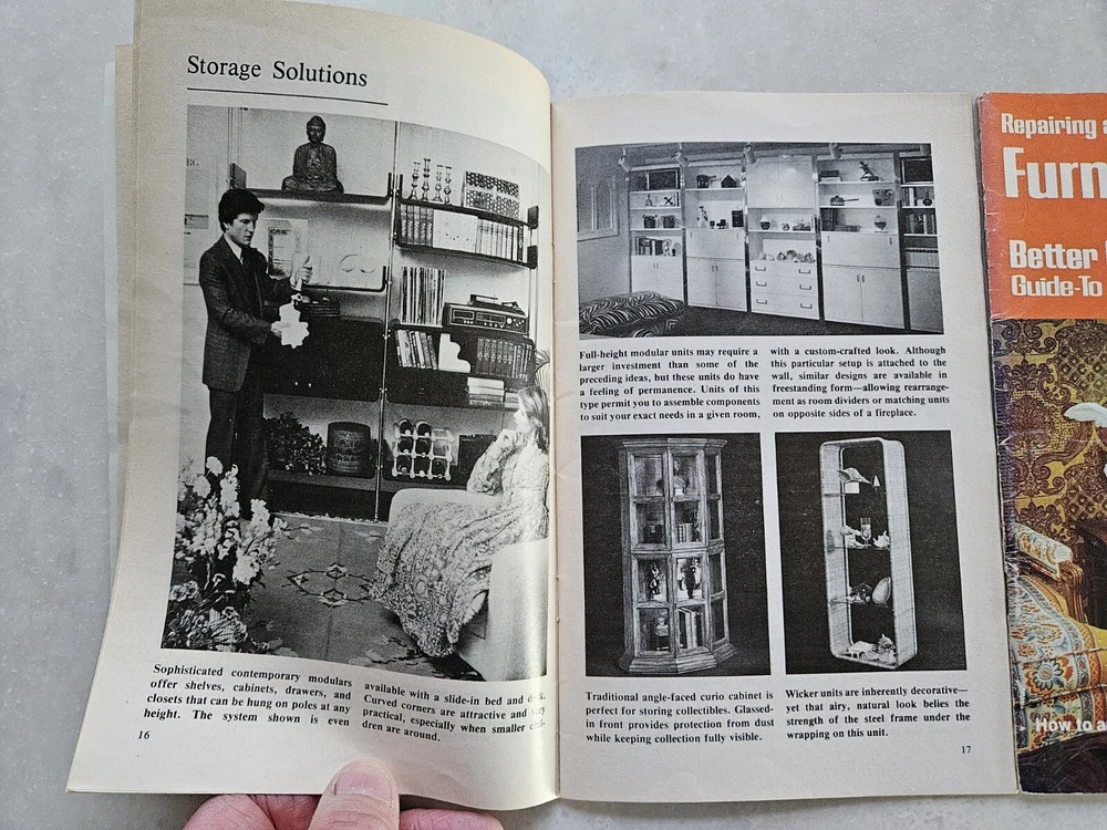 Better Homes And Gardens Bookshelves & Storage , And Repairing & Refinishing Furniture Booklets. Each are 50 page saddle-stitched booklets in acceptable condition. Rub wear to covers. Normal wear to edges and corners.