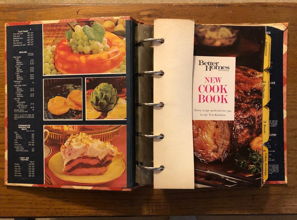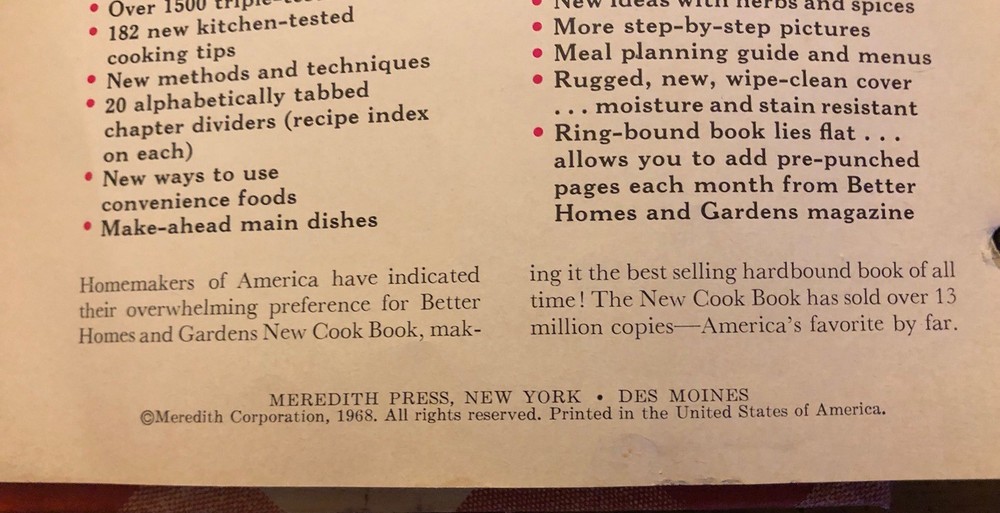 This vintage 1968 Better Homes And Gardens Cook Book, published by Meredith Press, is a must-have for any baking enthusiast. With tab indexing and a ring bind, it's easy to navigate and find your favorite recipes. The hardcover book is in good condition and will make a great addition to any cookbook collection. This original edition is printed in English, with a focus on cooking and baking. It's a great collectible item for anyone interested in vintage cookbooks. The book was printed in the United States and has special attributes like tab indexing and a ring bind. Add this to your library and start cooking up a storm! Couple pages apparently stained . Pictures to show.