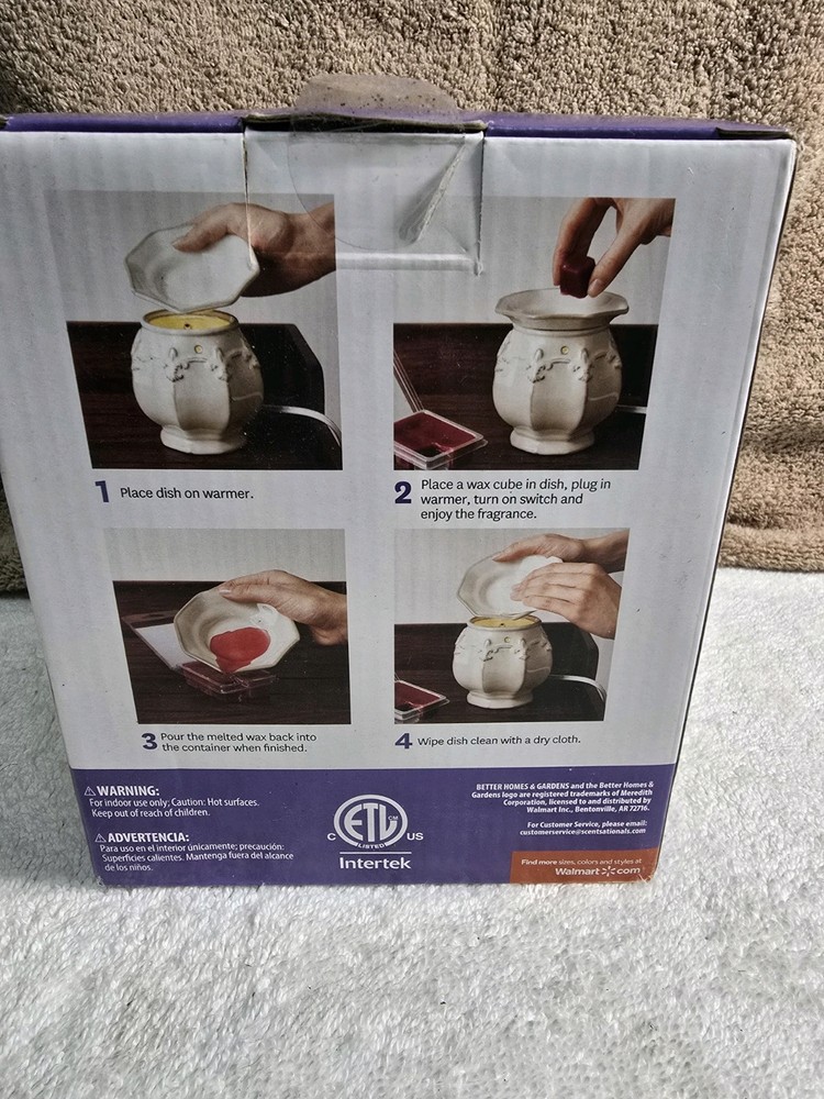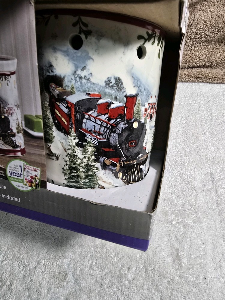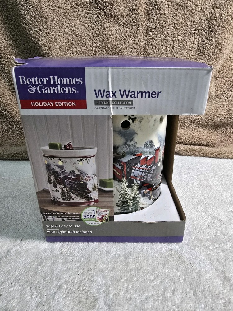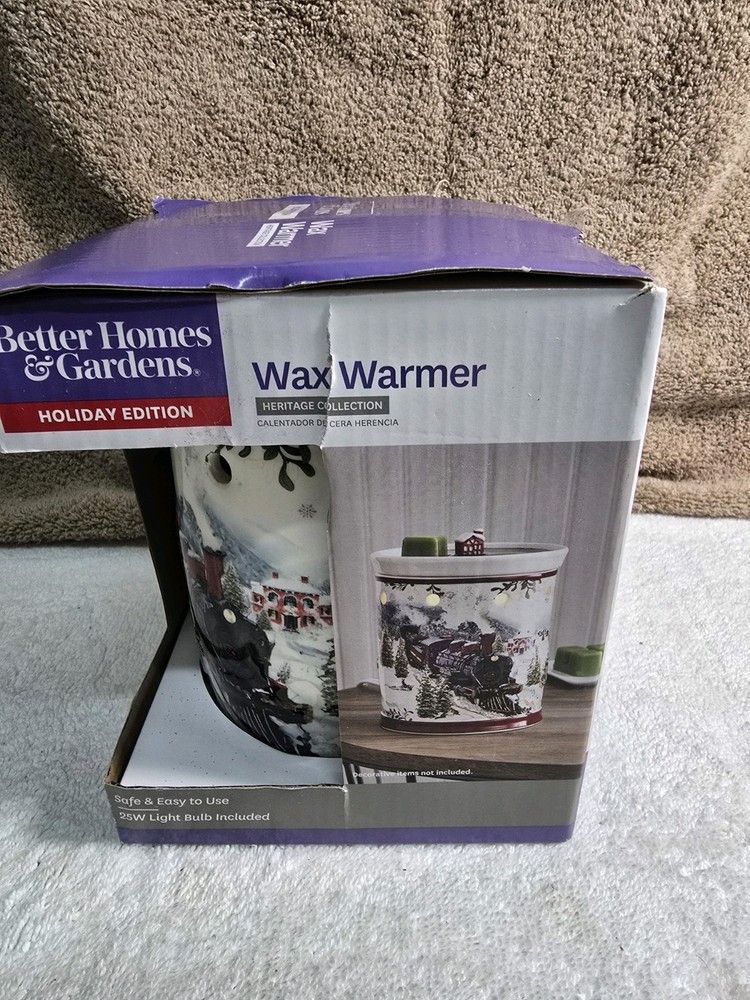 This is a Better Homes and Gardens Holiday Edition Wax Warmer from the Heritage Collection. It is an electric oil/wax warmer designed for Christmas occasions, made of wax with a holiday scent. The product features slow burning and is crafted in China. Ideal for the living room, it is not handmade.