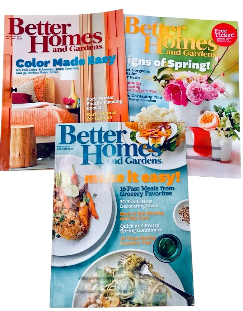 Better Homes And Gardens Magazines Set Of 3 Issue From 2011 February-Color made easy, March-make it easy, & May-signs of spring. Please see pictures for further content and condition. Very Good Condition, no torn pages or marks. Same or next day USPS shipping.