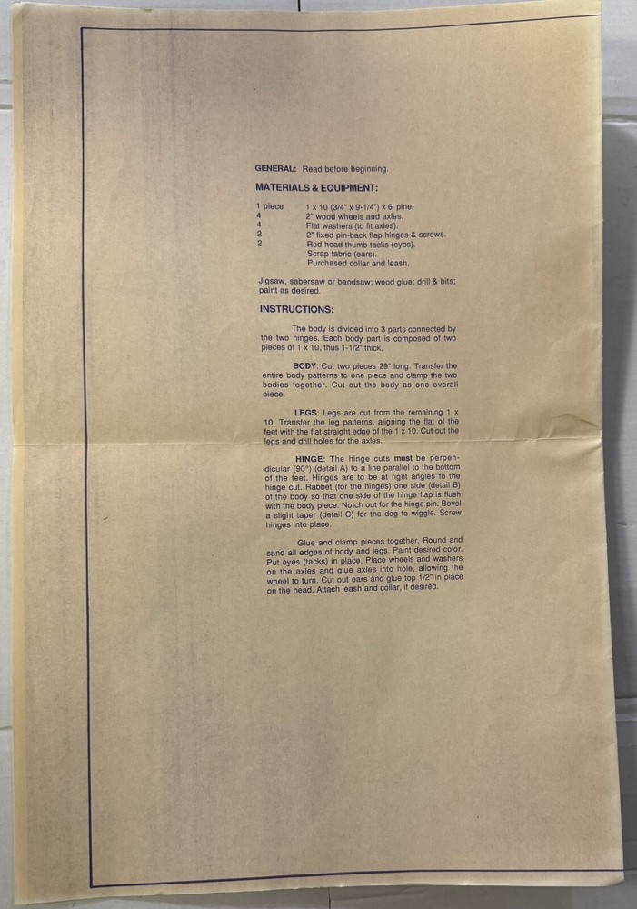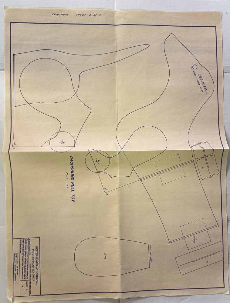 This Better Homes And Gardens Project Plan No. 50825 is perfect for anyone looking to add a charming touch to their home decor with a DIY project. The Dachshund Pull Toy plan is great for dog lovers and those who enjoy building and creating their own home accessories. With detailed instructions and blueprints, this plan will guide you through the process of building a unique and adorable dachshund pull toy that is sure to delight anyone who sees it. Whether you're looking to add a fun and playful element to your living room or bedroom, this project is sure to bring a smile to your face. Get started on your next home improvement project with this Better Homes and Gardens Project Plan No. 50825 Dachshund Pull Toy. These plans are in very good condition. They were never cut and still all intact. Please see the pictures for details. If you have any questions, please feel free to ask. Thank you.