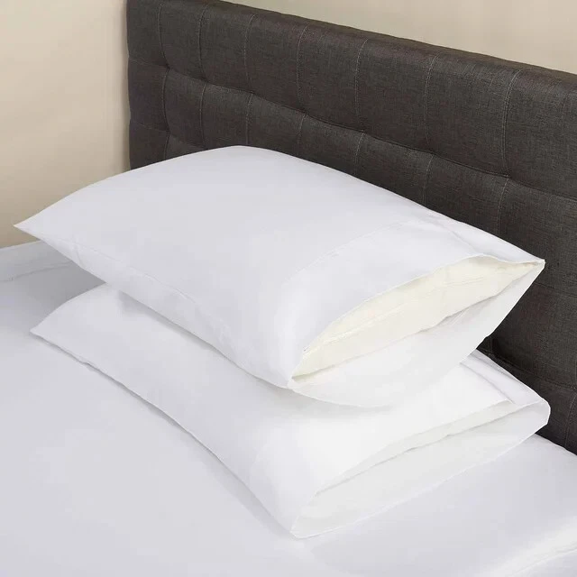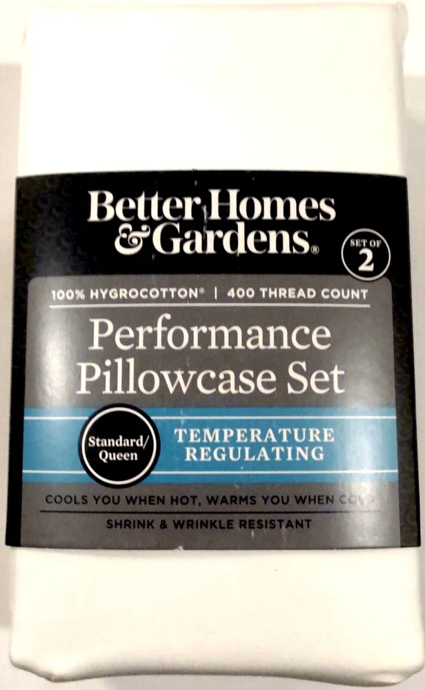 Better Homes &Garden 2 pack Pillowcase Queen Size 400 Thread Count Arctic White Set includes 2 Pillowcases. Sleep comfortably with Better Home and Gardens 400 Thread Count Cotton Pillowcases. These queen/standard size pillowcase sets are woven from treated cotton that gives a satin-like feel that delivers comfort all night. The construction of the cotton fabric has been treated to resist wrinkles wash after wash. These white pillowcases pair perfectly with your bedroom decor. With exceptional softness and easy-care maintenance, our Better Home and Gardens 400 Thread Count Cotton Pillowcase Sets are the perfect finishing touch to any bedroom. Better Homes & Gardens 400 Thread Count 100% Cotton Wrinkle Resistant Pillowcases, Queen/Standard, Arctic White: Set of matching 400-thread-count bedding essentials Lustrous, satin-like feel. Wrinkle-resistant construction offers a smooth look right out of the dryer. Pure cotton material keeps you cool and Comfortable all night long. Made of 100% Hygro cotton Queen/standard dimensions: 32" x 20" Pillowcase care: Machine wash warm, gentle cycle. Tumble dry low. Warm iron setting. Do not bleach. Set includes 2 Pillowcases. Sleep comfortably with Better Home and Gardens 400 Thread Count Cotton Pillowcases. These queen/standard size pillowcase sets are woven from treated cotton that gives a satin-like feel that delivers comfort all night. The construction of the cotton fabric has been treated to resist wrinkles wash after wash. These white pillowcases pair perfectly with your bedroom decor. With exceptional softness and easy-care maintenance, our Better Home and Gardens 400 Thread Count Cotton Pillowcase Sets are the perfect finishing touch to any bedroom. Better Homes & Gardens 400 Thread Count 100% Cotton Wrinkle Resistant Pillowcases, Queen/Standard, Arctic White: Set of matching 400-thread-count bedding essentials Lustrous, satin-like feel. Wrinkle-resistant construction offers a smooth look right out of the dryer. Pure cotton material keeps you cool and Comfortable all night long. Made of 100% Hygro cotton Queen/standard dimensions: 32" x 20" Pillowcase care: Machine wash warm, gentle cycle. Tumble dry low. Warm iron setting. Do not bleach.