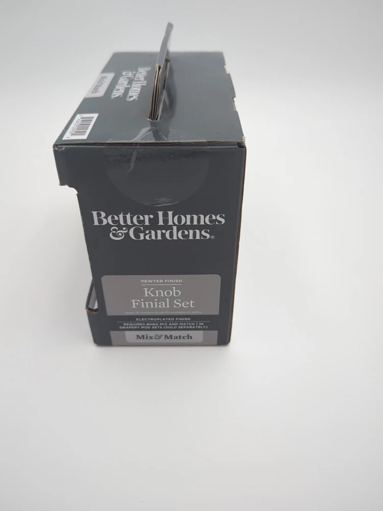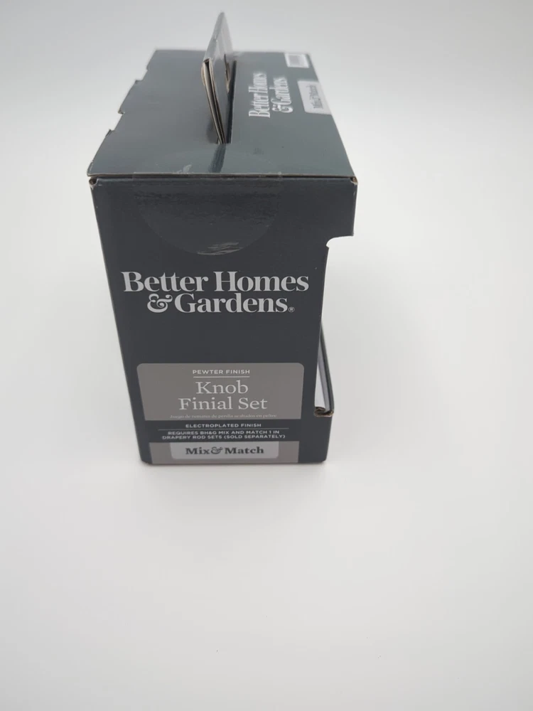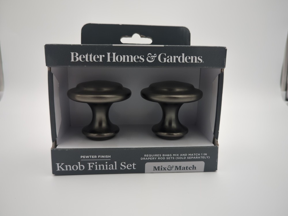 Add a touch of elegance to your window treatments with this set of two Better Homes & Garden Curtain Rod Finials. These finials feature a classic design with a pewter plated finish that complements any decor. The item diameter is 3 inches and the item length is 2.75 inches, making them suitable for a variety of window sizes. The finials are easy to install with a screw-on mounting system. The set includes two finials and does not include a rod type. Perfect for those looking to add a classic touch to their home or office. This is an example picture of the item for sale. I have 3 total units available, each one is new in the original box.