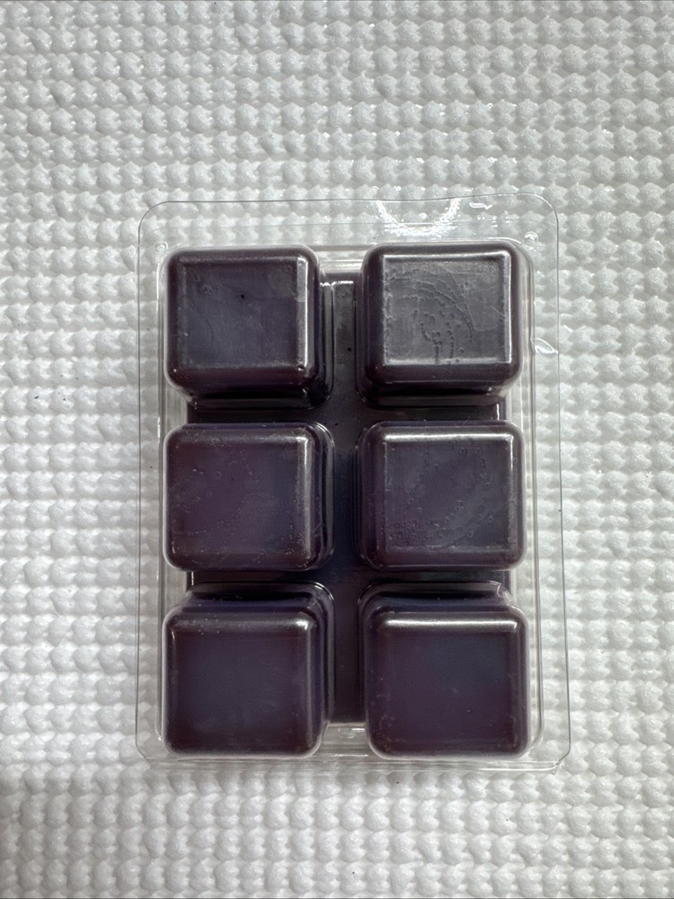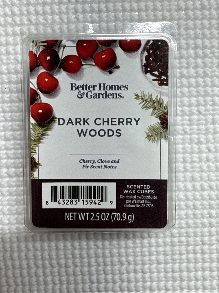 The Better Homes & Garden Dark Cherry Woods wax melts come in a pack of 6 small square melts. These scented melts are in a deep purple color and have a holiday-themed fragrance of Dark Cherry Woods. Made from wax, they provide a cozy and inviting atmosphere for your home.