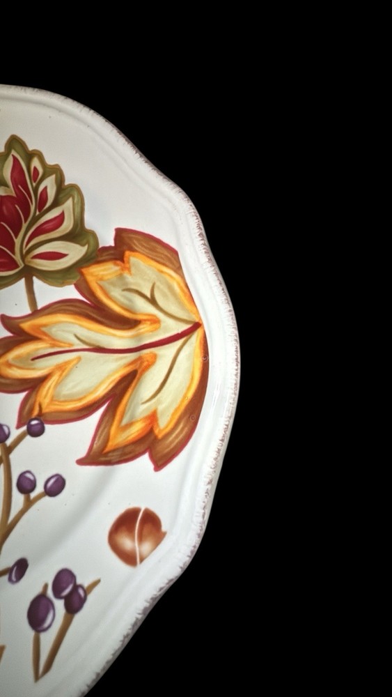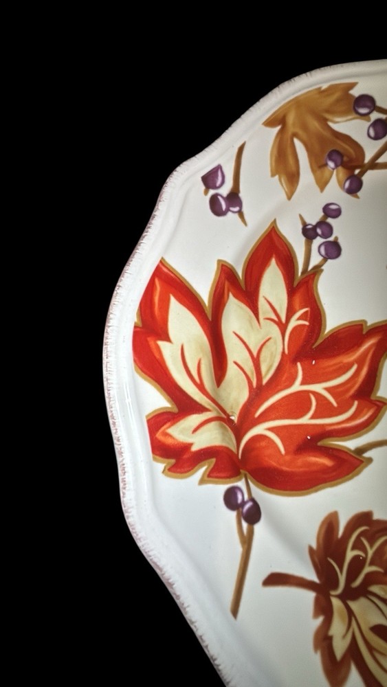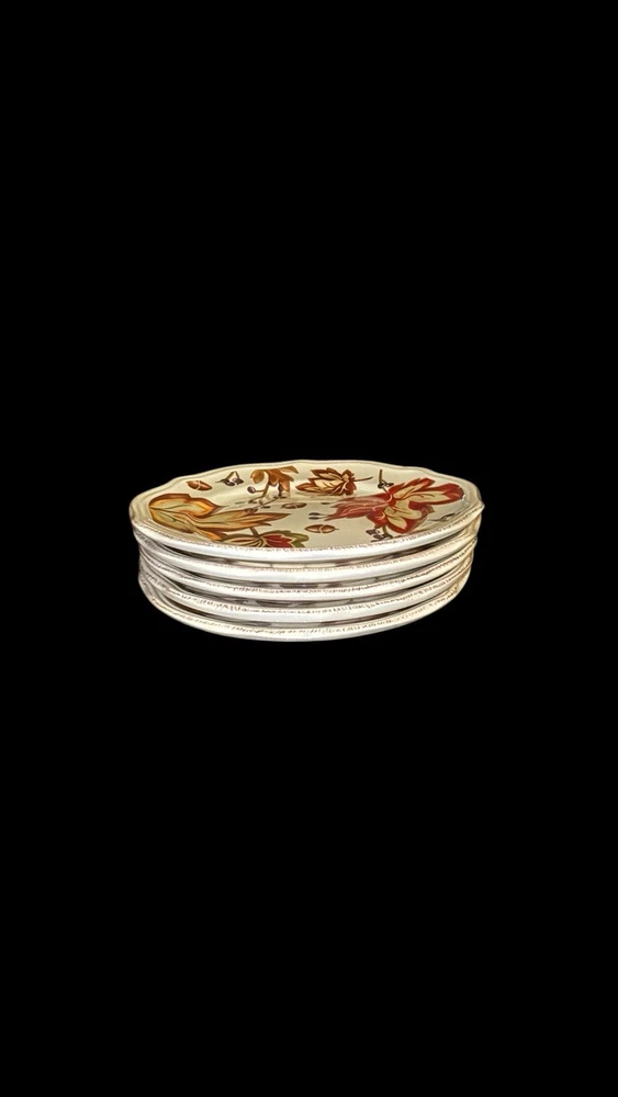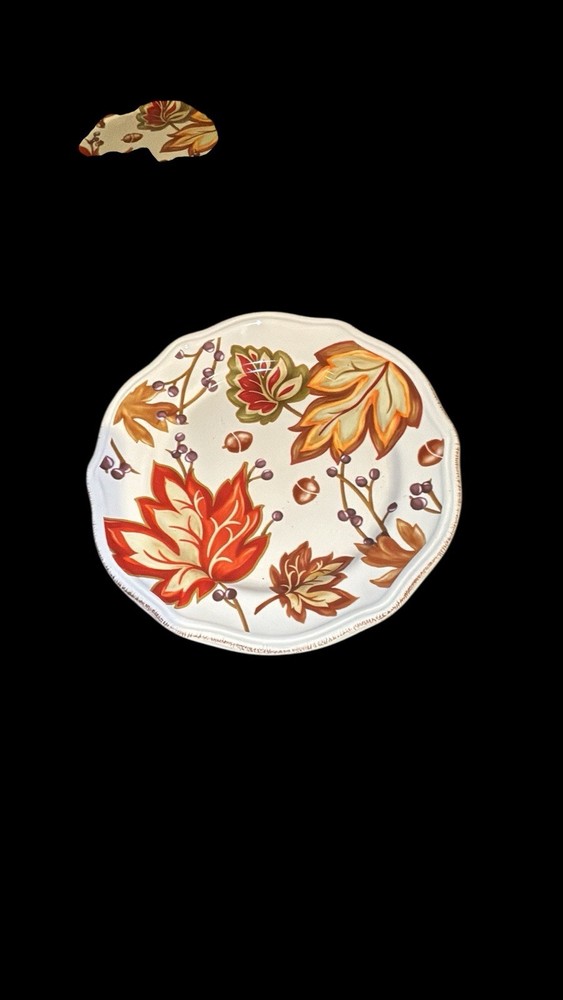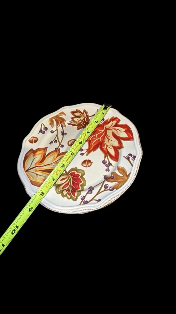 The Better Homes & Garden Harvest Leaves Cream Mist Salad Plate set includes five 8.5-inch ceramic plates with a garden harvest pattern featuring fall leaves. These round plates are decorated with scalloped edging and a glossy finish, making them suitable for all occasions and Thanksgiving celebrations. The multi-color plates are dishwasher and microwave safe, stackable, and bear the Better Homes & Gardens brand, adding a decorative touch to your table setting. Made in China using pottery techniques, these plates are a vintage-inspired addition to your home decor.