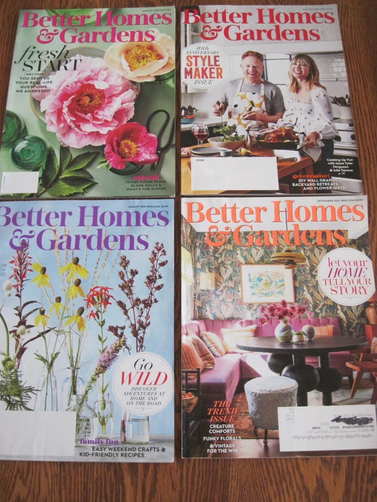 This is a lot of 4 Better Homes & Garden magazines. The issues are: January 2020 May 2021 August 2021 September 2021 Smoke-free home. Great helpful articles, recipes and photographs.