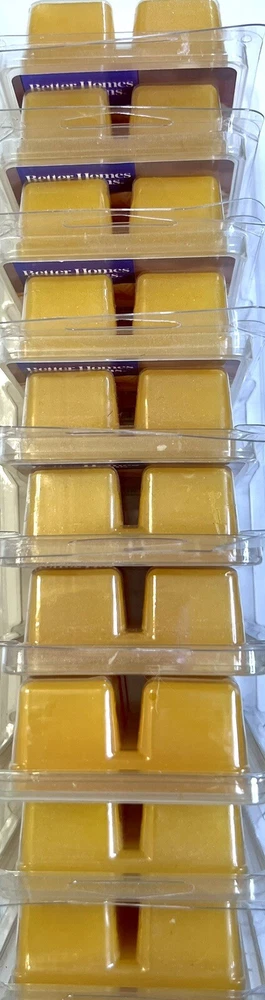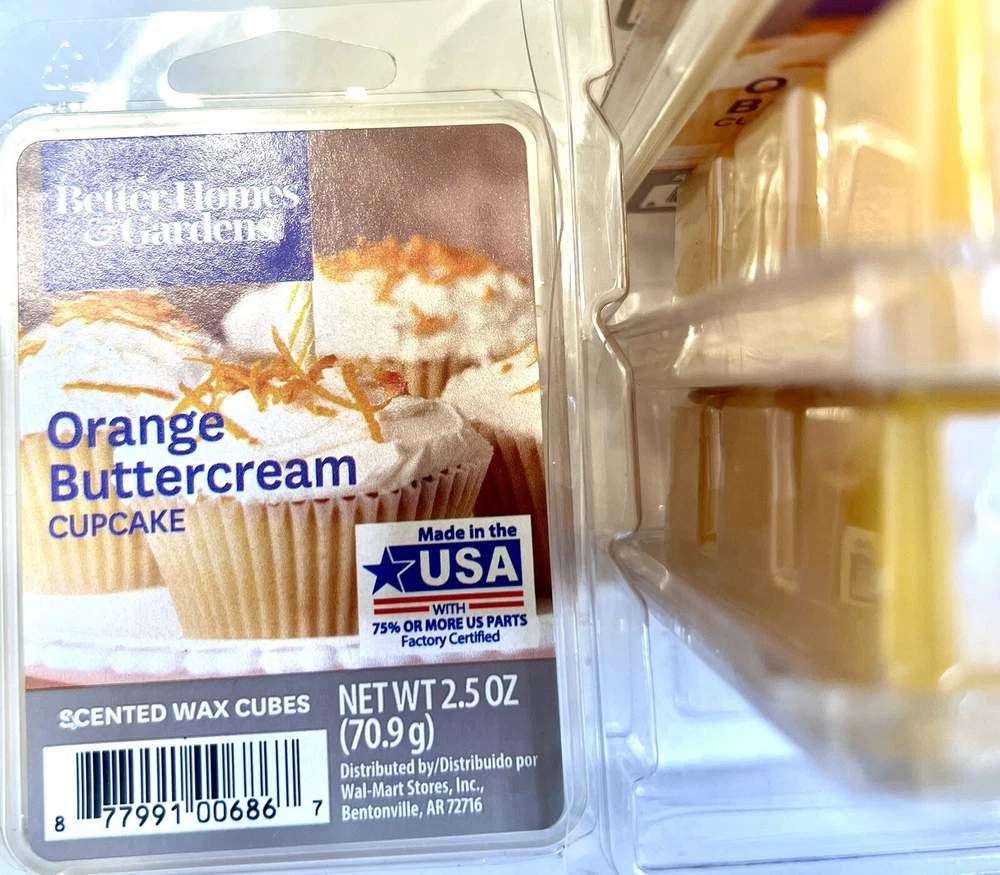 Each Pack has 6 Cubes, 10 Packs per Bundle Orange Buttercream Cupcake Scented Wax Melts, Better Homes & Gardens, 2.5 oz (10-Packs in Bundle) NEW Better Homes & Gardens 2.5 oz Orange Buttercream Cupcake Scented Wax Melt features irresistible notes of freshly baked vanilla cupcakes gleaming with the rich essence of sweet buttercream garnished with a spray of zesty orange. Better Homes & Gardens 2.5 oz Orange Buttercream Cupcake Scented Wax Melts are for use in an electric wax warmer and release a soothing highly fragrant scent into the air immediately upon melting. They are ideal for spreading a relaxing scent and welcoming atmosphere throughout your home. Simply break off a piece and add it to your favorite electric wax warmer. Highly fragranced Releases a soothing fragrant scent Replace wax melts when fragrance is gone Easy clean up No flame or soot residue Wax can be recycled or reused Use with Electric Wax Warmer Assortment of Better Homes & Gardens Scented Wax Melts & Wax Melt Warmers available