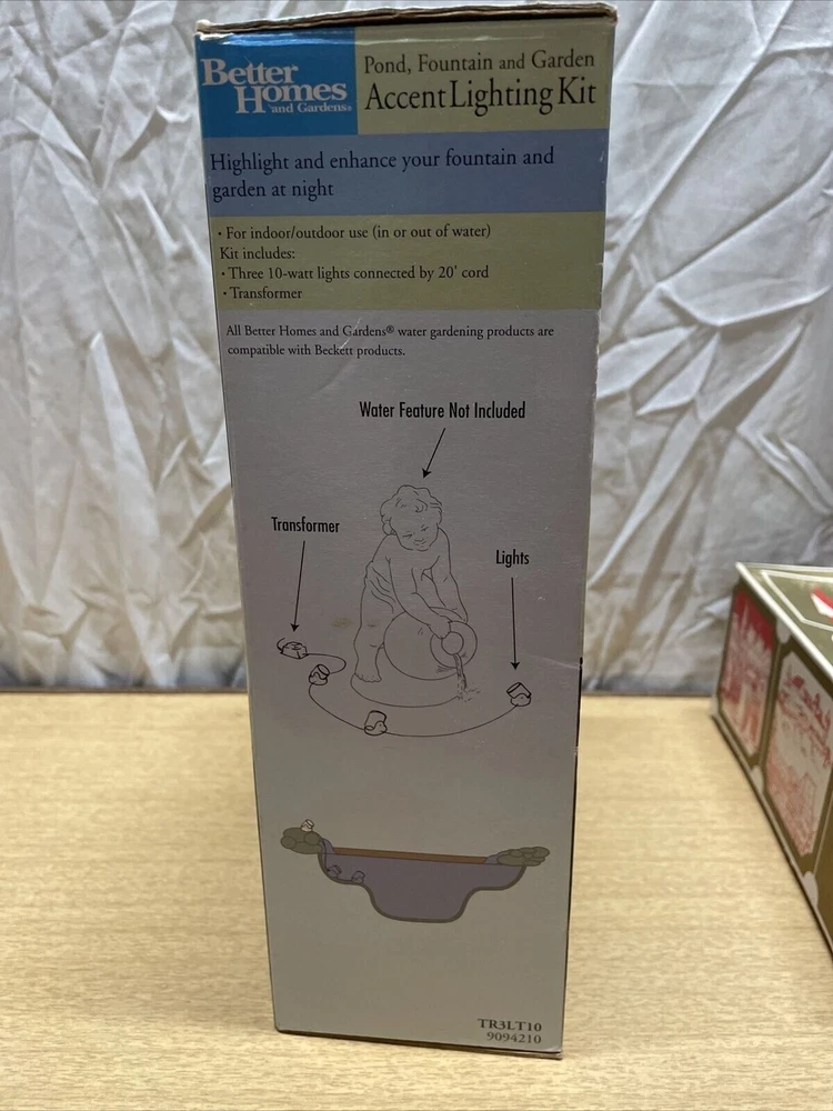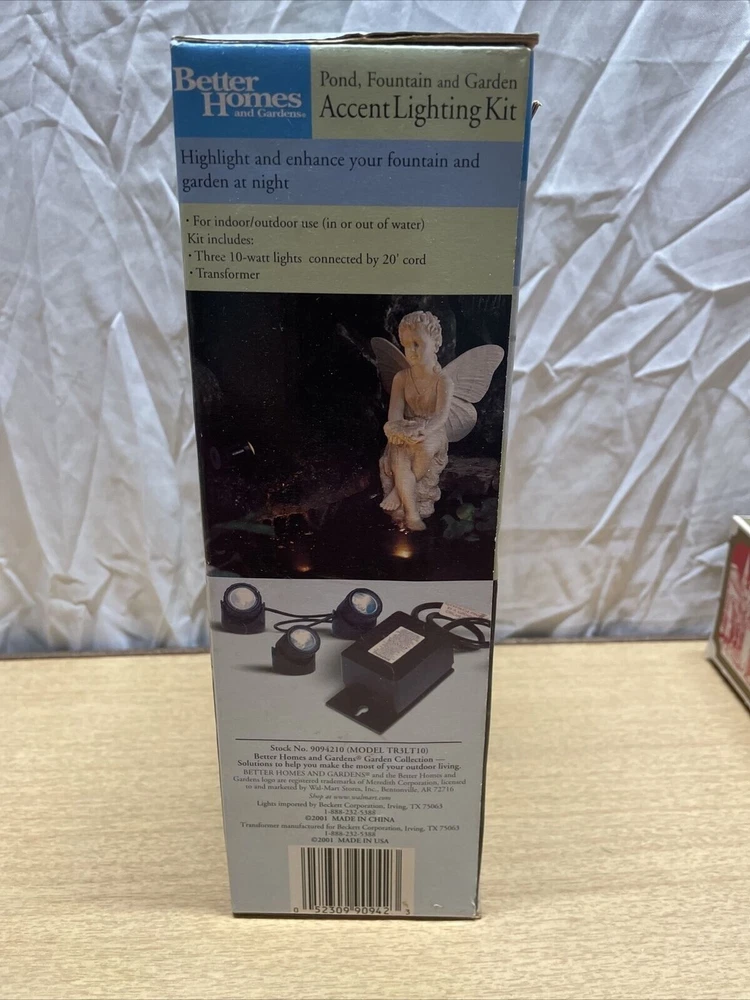 Better Homes Garden Pond Fountain Accent Light Kit New Without Transformer. Please note includes lights and connector wiring only. Will need transformer for 30 watt set. Made by Beckett transformer likely available from them and online. From a Delaware estate found well packed and stored. Also have matching fountain 310 gph underwater pump and fountain waterbell shape nozzle listed. If interested in all as a package make an offer. Satisfaction guaranteed. Free return shipping on domestic orders.