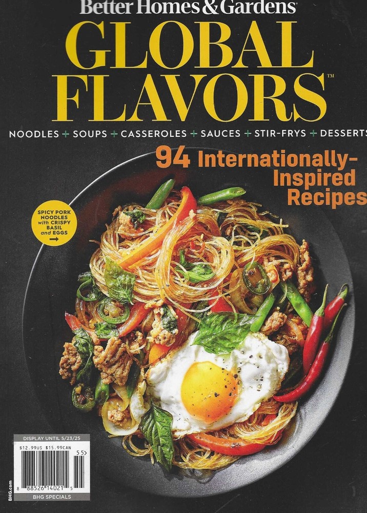 The product is a 2025 edition of Better Homes & Gardens magazine focusing on global flavors, featuring 94 internationally inspired recipes in genres like stir-frys, sauces, casseroles, soups, and noodles. It is a physical magazine in English, published annually in the United States with no subscription option available.