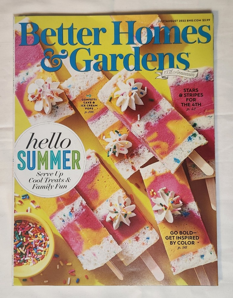 Celebrate the 100th anniversary of Better Homes & Gardens with this special edition publication featuring a collection of Hello Summer recipes. Experience a burst of flavor with mouth-watering dishes that are perfect for any occasion. Written in English, this magazine is a must-have for any home and garden enthusiast. This publication is a special issue that was published in July and August of 2022 in the United States. It is a great addition to any collection and perfect for those who love home and garden genres. This item is not signed and does not come with a subscription. Don't miss out on this opportunity to discover new recipes and get inspired with Better Homes & Gardens.
