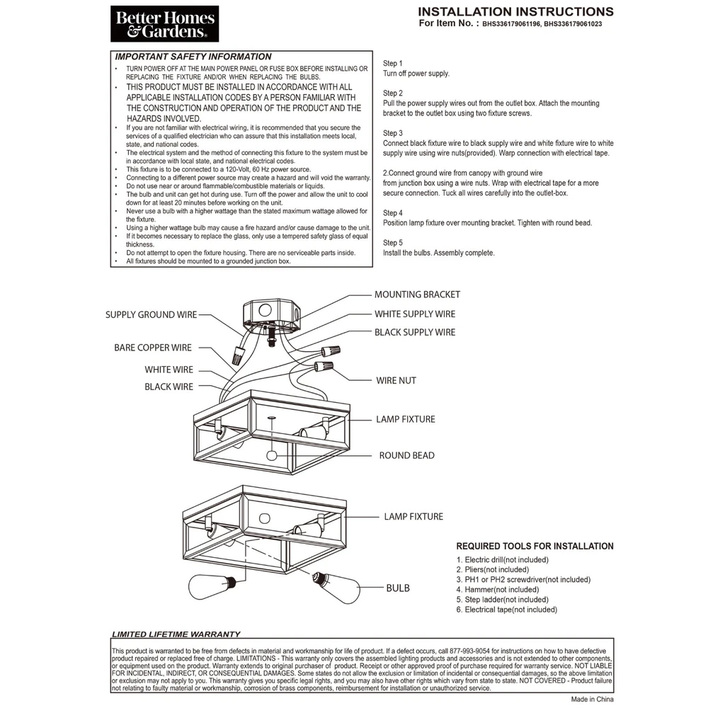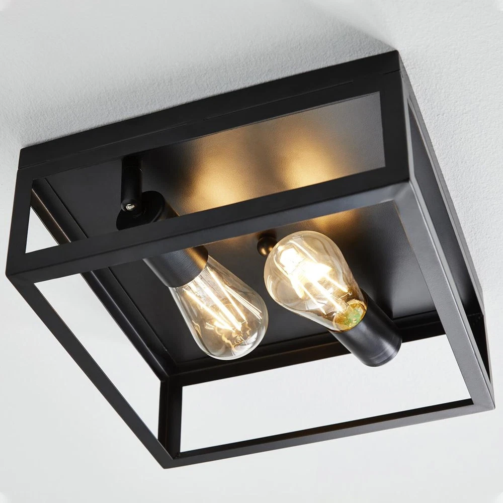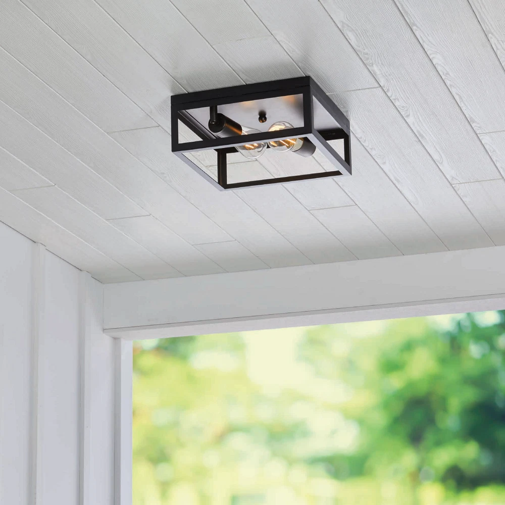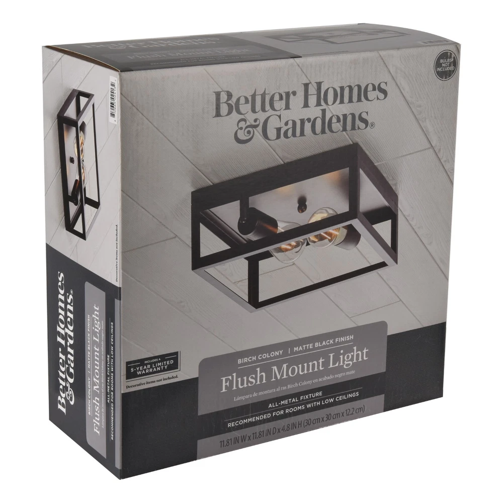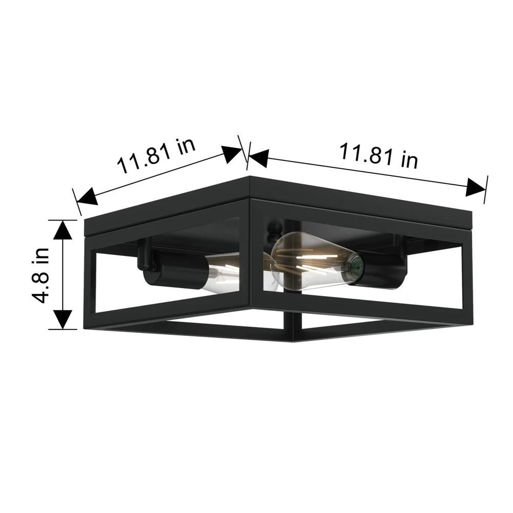 The Better Homes & Gardens Modern 2-Light Square Flush Mount Ceiling Light Black Finish fixture is well-designed for your home decoration. The ceiling light has a whole metal housing. It is most suitable to be installed in rooms with low ceilings. It should be the most suitable to be installed in places like the hallway, living room, and kitchen. This fixture is equipped with a dimmable 40W equivalence ST19 filament bulb. This decorative bulb is rated to last 13 years based on 3 hours per day use. This light bulb uses only 5 watts of energy to produce light, which is equal to light from a 40W incandescent that is a 90% savings over traditional lighting and that means savings on your energy bill every month and with the energy certification to prove it credibility.(BHS336179061023) Better Homes & Gardens Flush Mount Ceiling Light Modern style Matte black finish E26 base socketed, suitable for used with most E26 screw in base light bulbs (2) Edison bulbs are required (sold separately) Assembly dimensions: 11.81x11.81x4.8IN Model #BHS336179061023