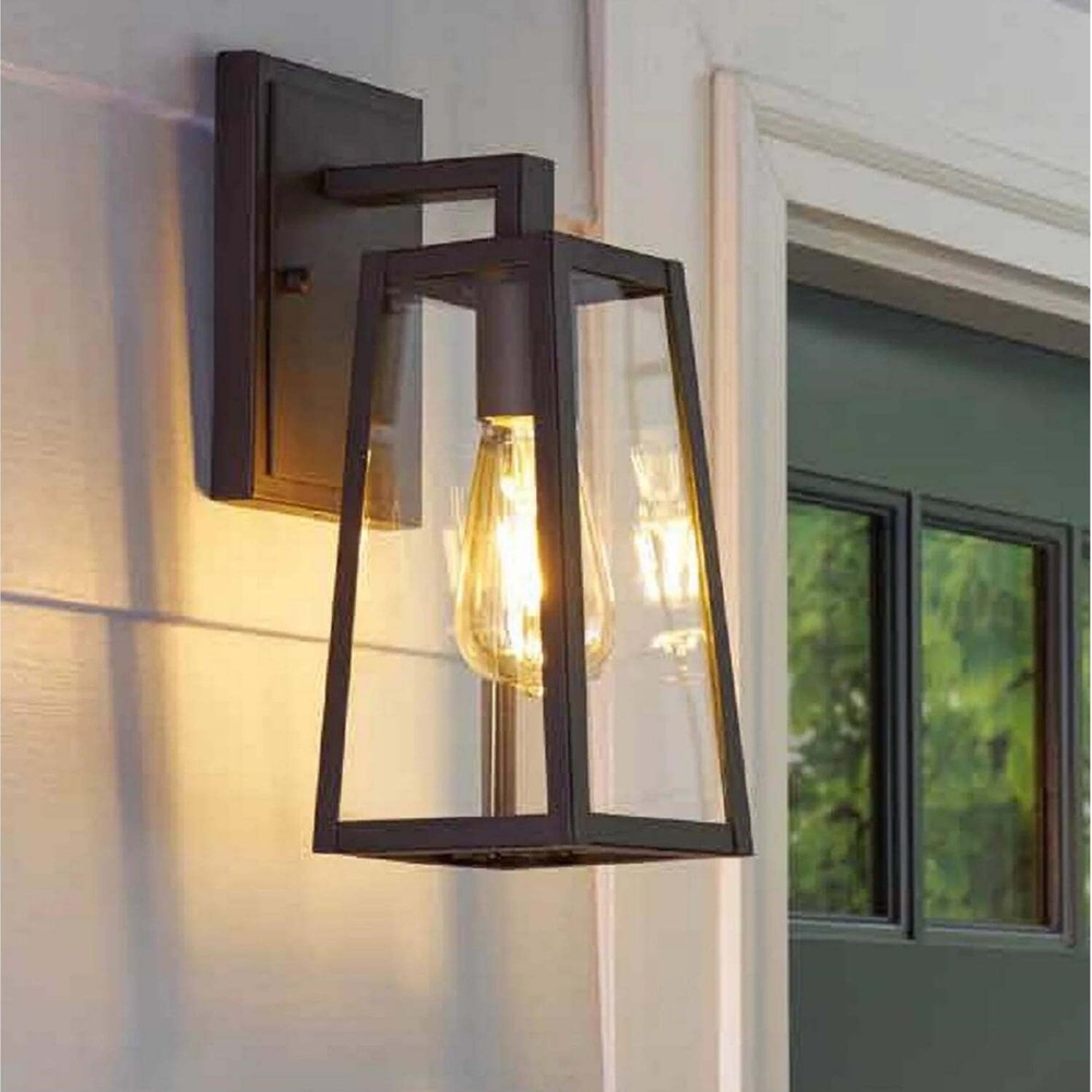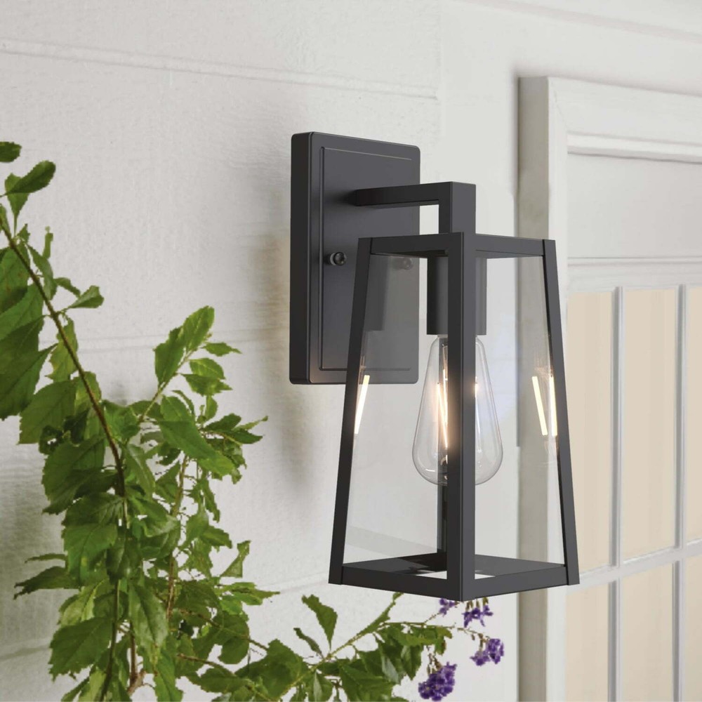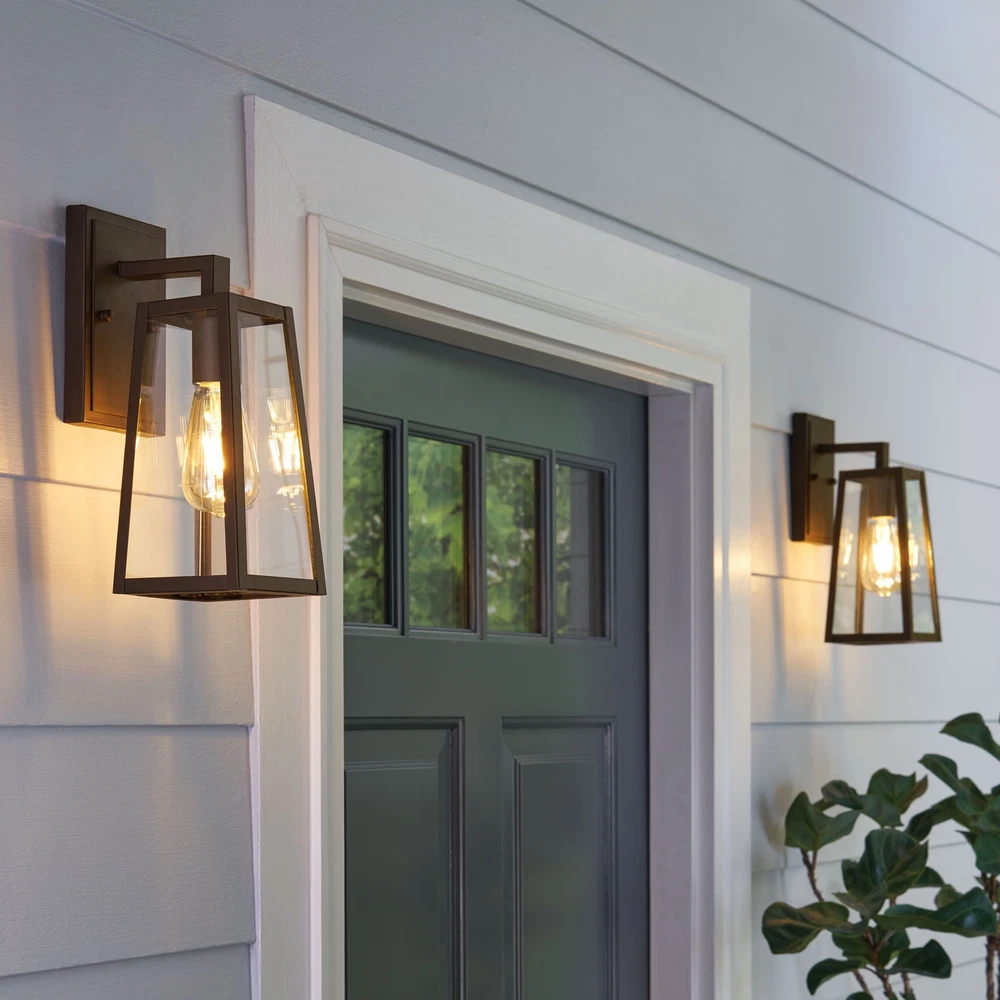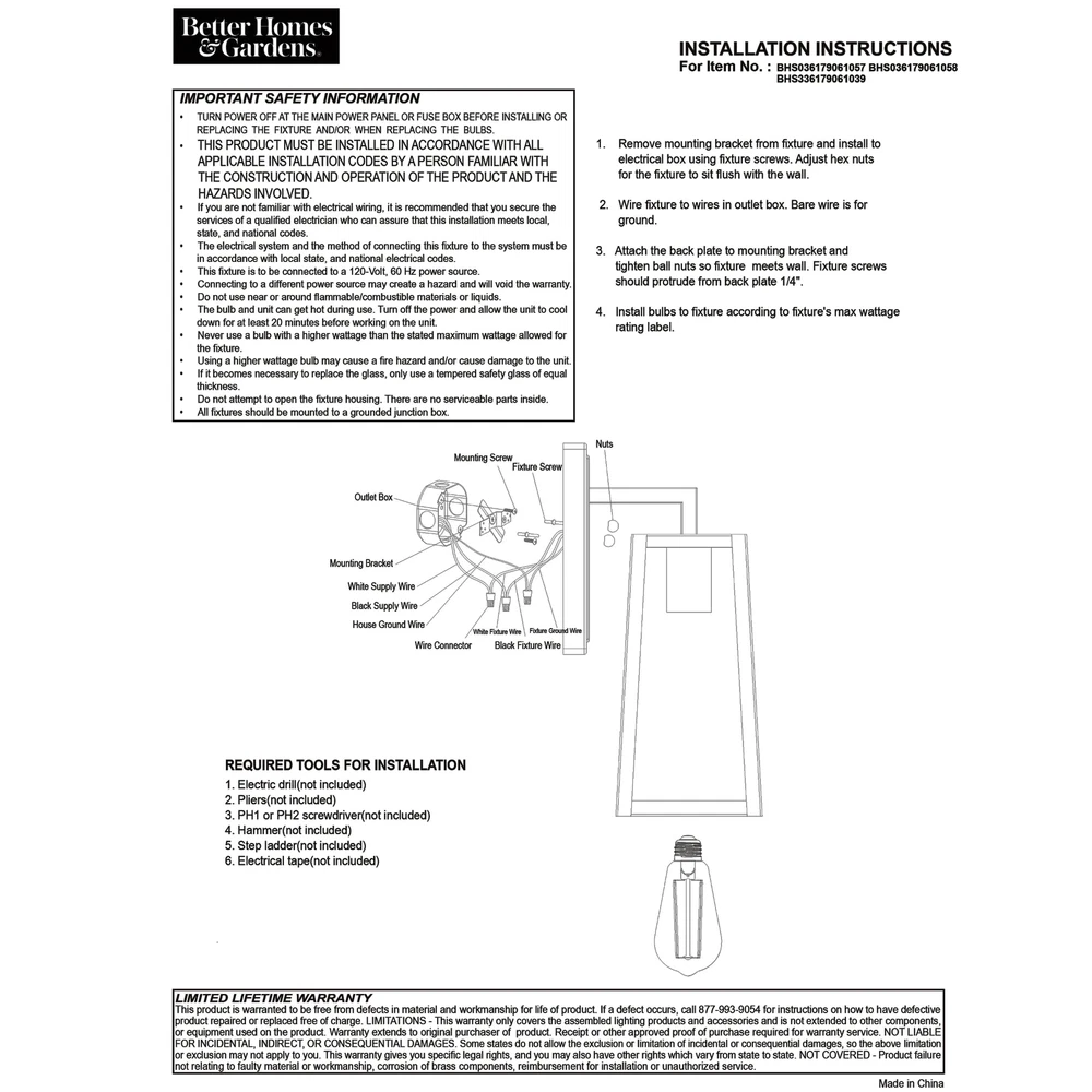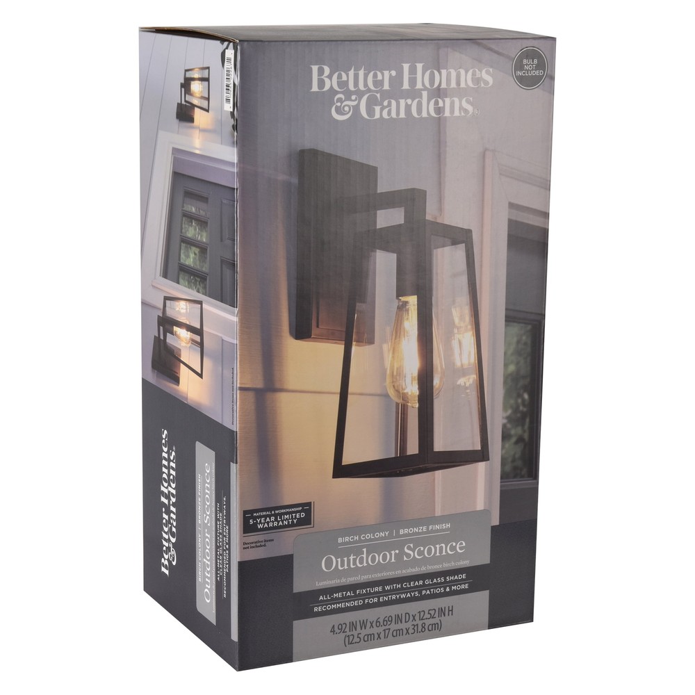 The Better Homes & Gardens Hardwired Classic wall light fixture is well-design for your home decoration. The wall mount light has a clear square-shaped glass. Which offers a contemporary style for a variety of exteriors. This metal light fixture features a matte black finish. This wall mounted outdoors light is a great decoration to your house. It is most suitable to be installed outside. This one-light wall light can beautify your living environment and illuminate for you and others. ST19 LED bulbs recommended to complete look, not included. Better Homes & Gardens Classic Outdoor Wall Light 12.5" in height Wall scone, wall lantern, wall lighting fixture Crafted from metal in oil rubbed bronze finish Clear glass shades Wet rated - suitable for used indoors and outdoors Compatible for use with dimmer switch 120V Hardwired (Corded Electric); professional installation recommended E26 socketed, Easy Bulb replacement (1) E26 base Edison bulb is required, bulb not included Bronze Finish Wet rated, suitable for used indoors and outdoors