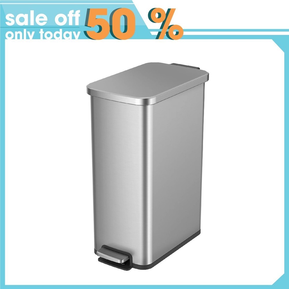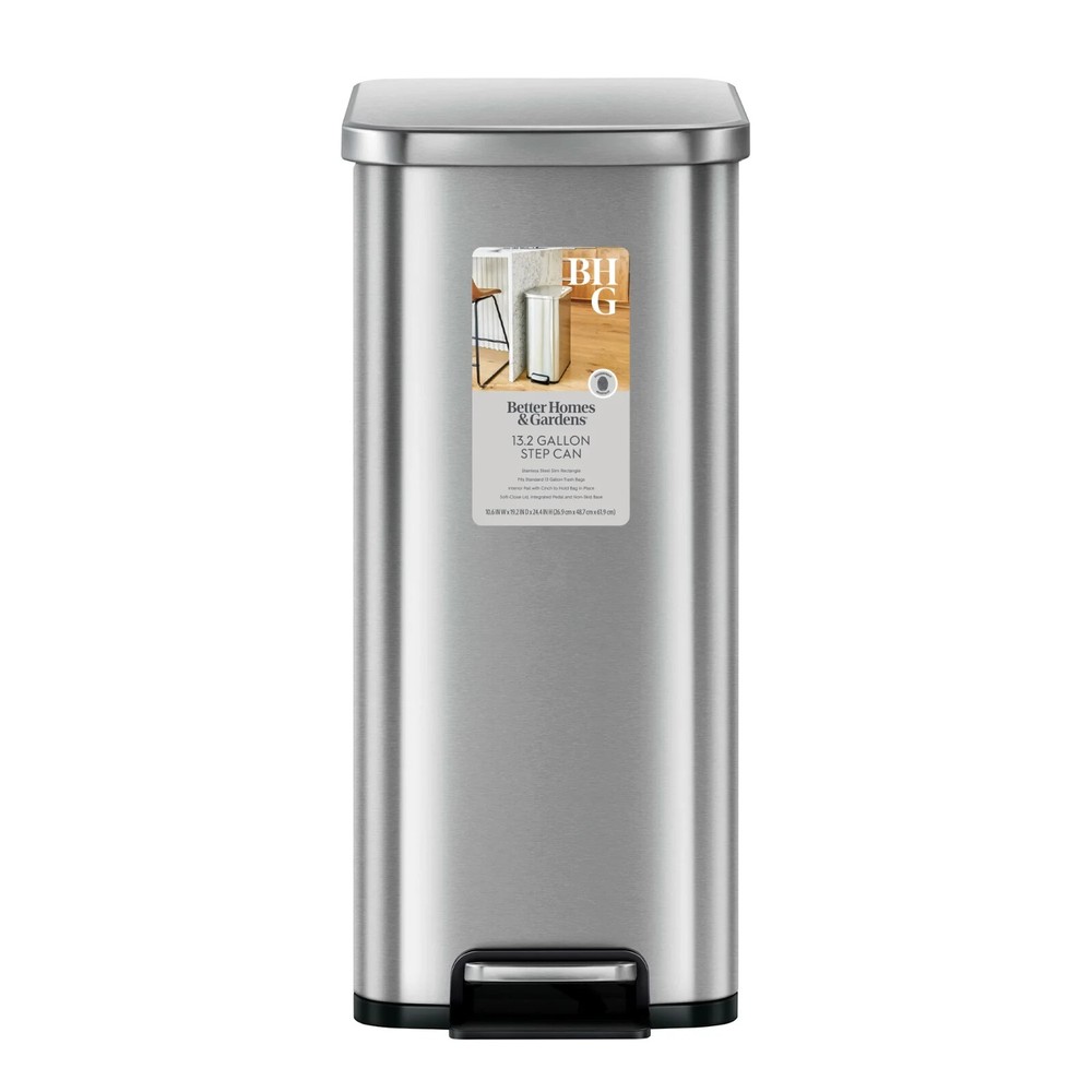 Better Homes & Gardens 13.2 Gallon Slim Stainless Steel Step Trash Can has a slim vertical design that allows placement in narrow spaces that other trash cans may not work. Works in any room in the house, and the brushed stainless-steel finish blends nicely with any home style. This trash can features a gentle open and soft close lid, thanks to the dual-force damper system operated by the durable step-pedal mechanism. The lid can also be locked in an open position for longer tidying tasks. Constructed for years of daily, hands-free use. This fingerprint-resistant finish on this sleek stainless trash can is easy to maintain with a wipe of a soft damp cloth. The removable inner bucket makes emptying the trash can quick and easy. Fits any standard 13 gallon kitchen trash bag, no special order bags needed. 13.2 gallon / 50 liter capacity. Slim, Vertical Design: Looks great in spaces other trash cans may not fit Material: Fingerprint resistant, brushed stainless steel finish Dual Damper System: Engineered to provide a smooth and silent close every time Durable Foot Pedal: Tested for years of hands-free daily use Stay Open Lid: Locked open position for longer cleaning sessions Easy Maintenance: Simply wipe clean with a soft, damp cloth No Special Orders: Uses standard 13 gallon kitchen trash bags Dimensions: 10.6" W x 19.2" D x 24.4" H Why You'll Love It: Slim design fits flush against a wall or cabinet, perfect for tight spots