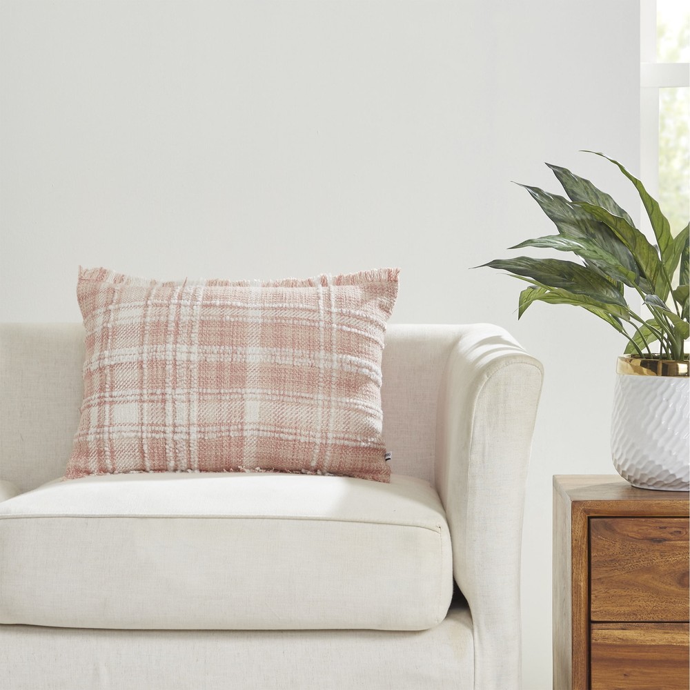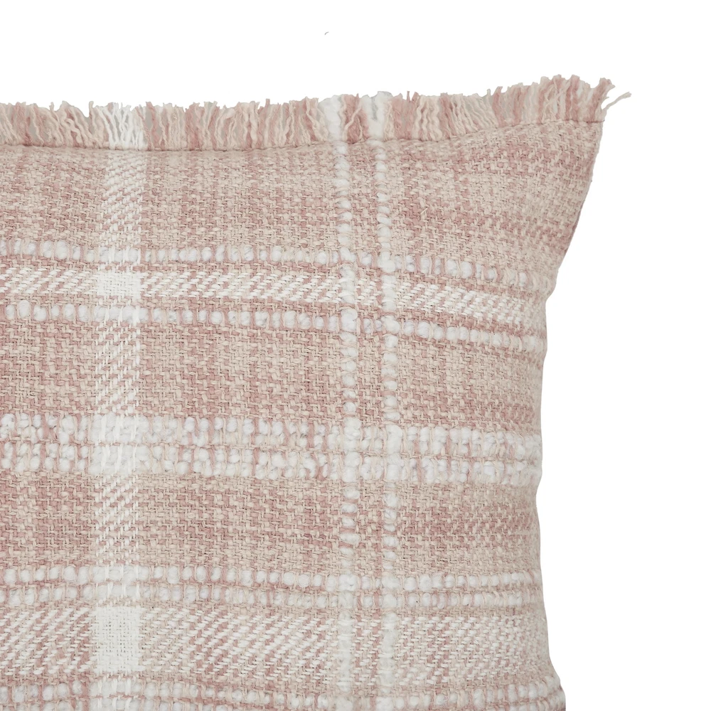 Blush pink decorative throw pillow Features woven plaid patterns and fringe trim Oblong lumbar pillow measures 14 inches x 20 inches Fabric details – cover face: 73% cotton, 27% polyester, cover back: 100% cotton, filler shell: 100% olefin, filling: 100% polyester Care instructions: Spot clean only Each pillow is sold separately Add cozy texture and classic pattern to your bed, couch, or favorite chair with the Better Homes & Gardens 14" x 20" Lulu Blush Plaid Cotton Rich Decorative Pillow. An effortlessly stylish accent for any room, this oblong decorative pillow has a woven blush pink plaid pattern with a fringe trim for a relaxed look. You can easily keep this cotton-rich decorative pillow fresh and looking new by periodically spot cleaning the fabric gently with a damp cloth as needed. Each decorative pillow measures 14 inches x 20 inches and is sold separately. Blush pink decorative throw pillow Features woven plaid patterns and fringe trim Oblong lumbar pillow measures 14 inches x 20 inches Fabric details – cover face: 73% cotton, 27% polyester, cover back: 100% cotton, filler shell: 100% olefin, filling: 100% polyester Care instructions: Spot clean only Each pillow is sold separately On May 27, 2025 at 01:07:09 PDT, seller added the following information: On Jun 4, 2025 at 01:14:00 PDT, seller added the following information:
