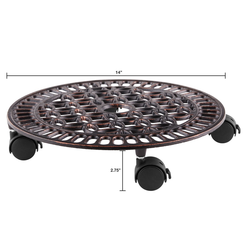Add a luxe look to your porch, patio, or sunroom with the Better Homes & Gardens 14inch plant caddy . This plant caddy made of heavy duty iron with self weight about 10 lbs,it can support Dia.16inch pot ;heavy gauge with powder-coated that made it all weather resistant and very durable,4 locking wheels to support safety and store your plant in the most convenient locations . Use it to plant indoor favorites, such as ferns, or outdoor favorites such as annuals. It is great way bring lush, natural beauty to your indoor and outdoor spaces.oor and outdoor spaces. Better Homes & Gardens 14inch Cast Iron Oil-Rubber Plant Caddy Great way to display your favorite houseplants, flowers, ferns, and more, or to create attractive Collapsible design for convenient storage and portability Easy to assemble and clean Ideal for adding greenery or flowering color indoors or outdoors Durable iron construction for long lasting use For use indoors or outdoors 14 Inch lattice cast iron plant caddy, Oil-Rubbed bronze finish Holds pots up to 16" diameter and weighing up to 120lbs. Arrives fully assembled Measures 14" Dia. x 2.8" H Wipe clean using a damp cloth