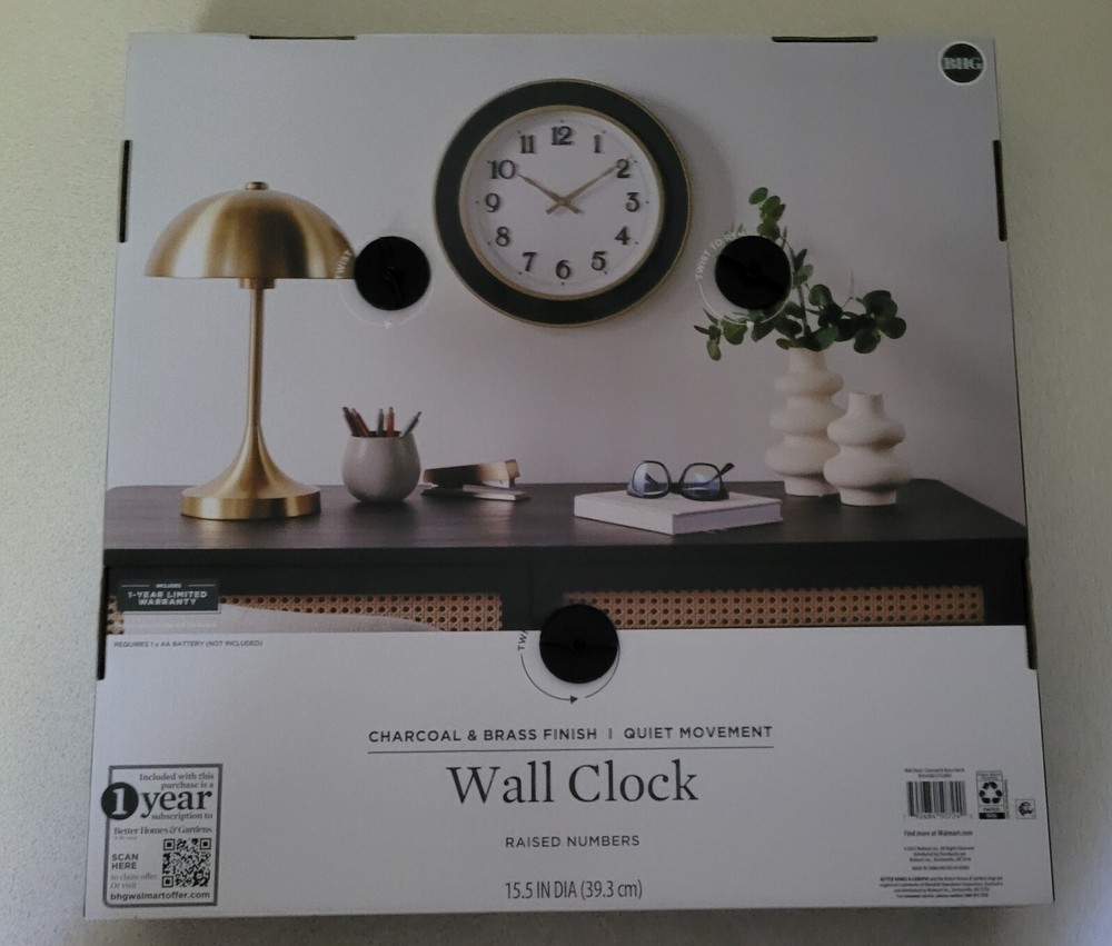 New hanging wall clock. Batteries not included. 15.5" diameter. Plastic with charcoal and painted brass-like finish....