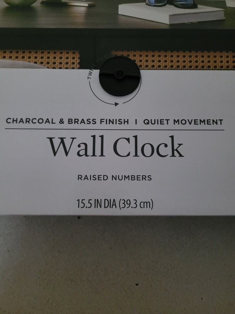 New hanging wall clock. Batteries not included. 15.5" diameter. Plastic with charcoal and painted brass-like finish.