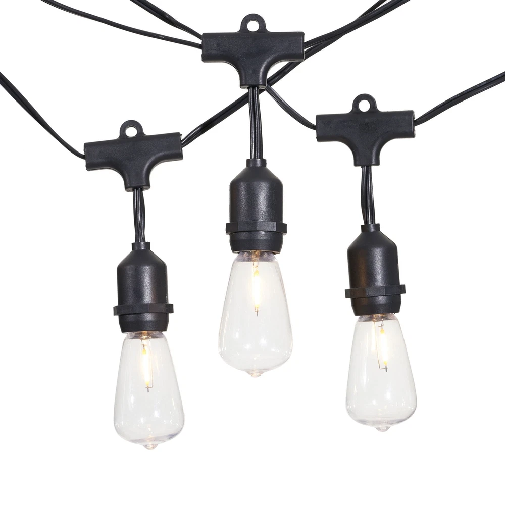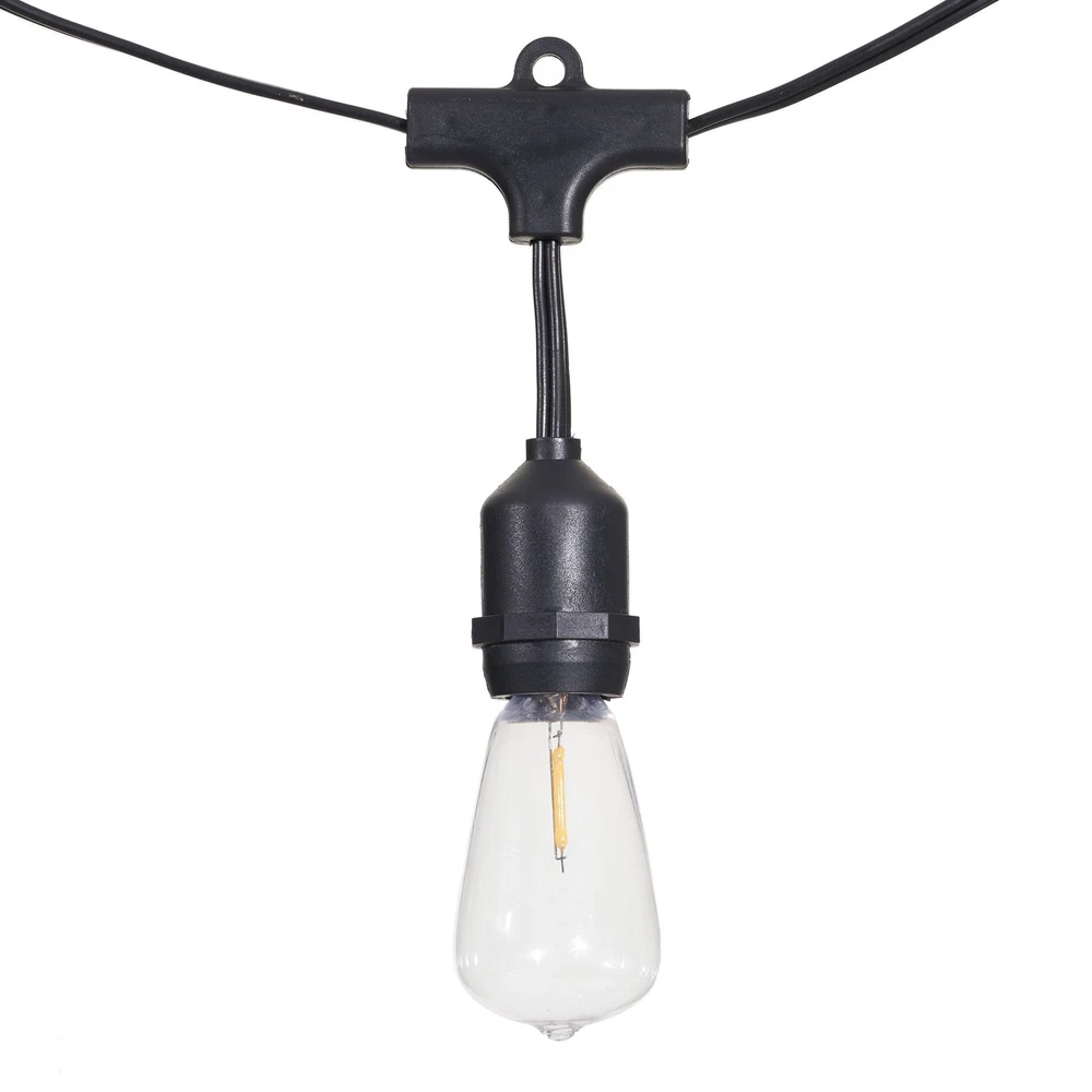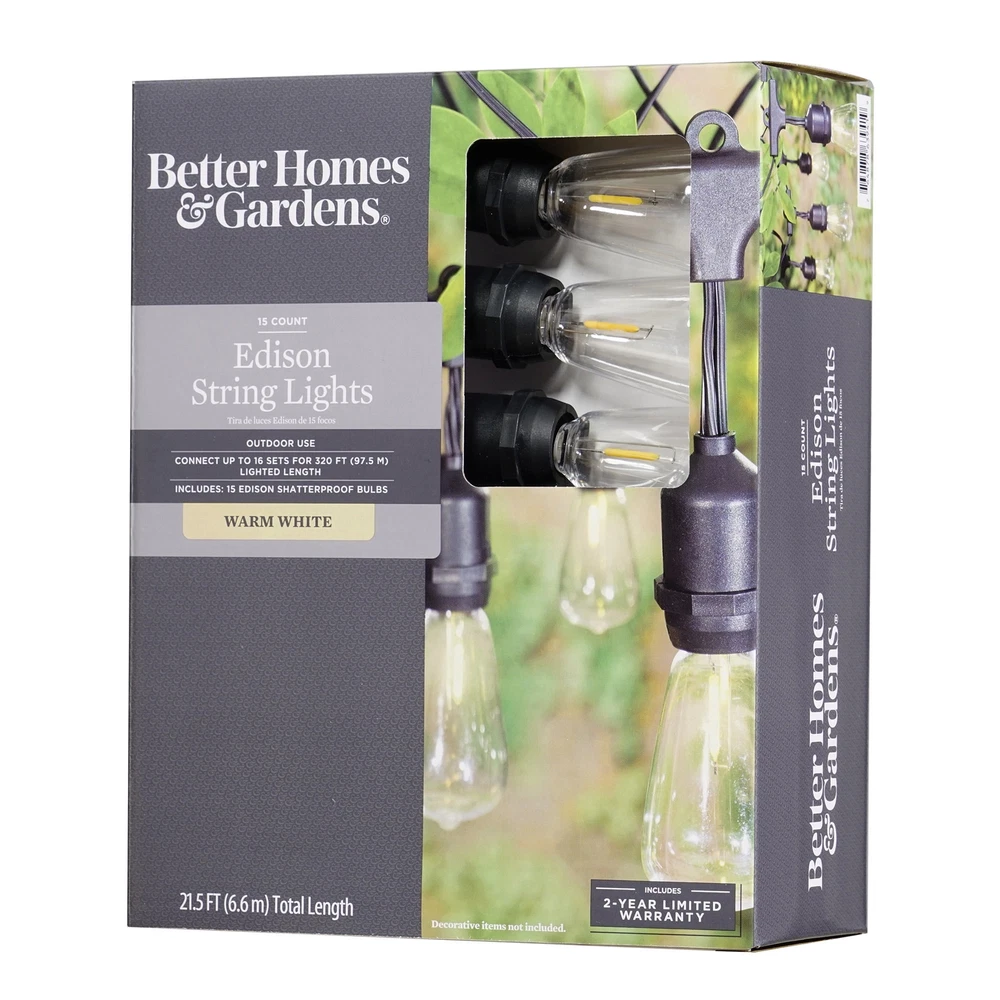 The Better Homes & Gardens 15-count LED Edison Bulb String Lights will give your home or yard a beautiful vintage look. These vintage-style lights can be used to decorate your back yard, back patio or even hang them on the pergola to give the perfect soft glow. They can also be used to decorate for a wedding, birthday party, or retirement party. These lights offer the perfect ambiance with just the right amount of light. The set is composed of 15 Warm White LED bulbs on black wire and has a total length of 21.5 feet. Ideal for indoor and outdoor use, end-to-end connectors allow you to connect up to 16 sets of this exact same light for a total lighted length of 320 feet to create your desired lighting effect. The Better Homes & Gardens 15-Count LED Edison Bulb String Lights are sure to ambiance and elegance to your evening. Set includes 15 warm white LED Edison bulbs on black wire Lighted length: 20' Total length: 21.5' Light bulb spacing: 17.2" End-to-end construction allows you to connect up to 16 sets for 320' total lighted length These vintage-style Edison lights offer the perfect ambiance with just the right amount of light Outdoor and indoor use with vintage Edison shatterproof bulbs Plug-in lights 2700K lighting brightness Model No.: 63-941