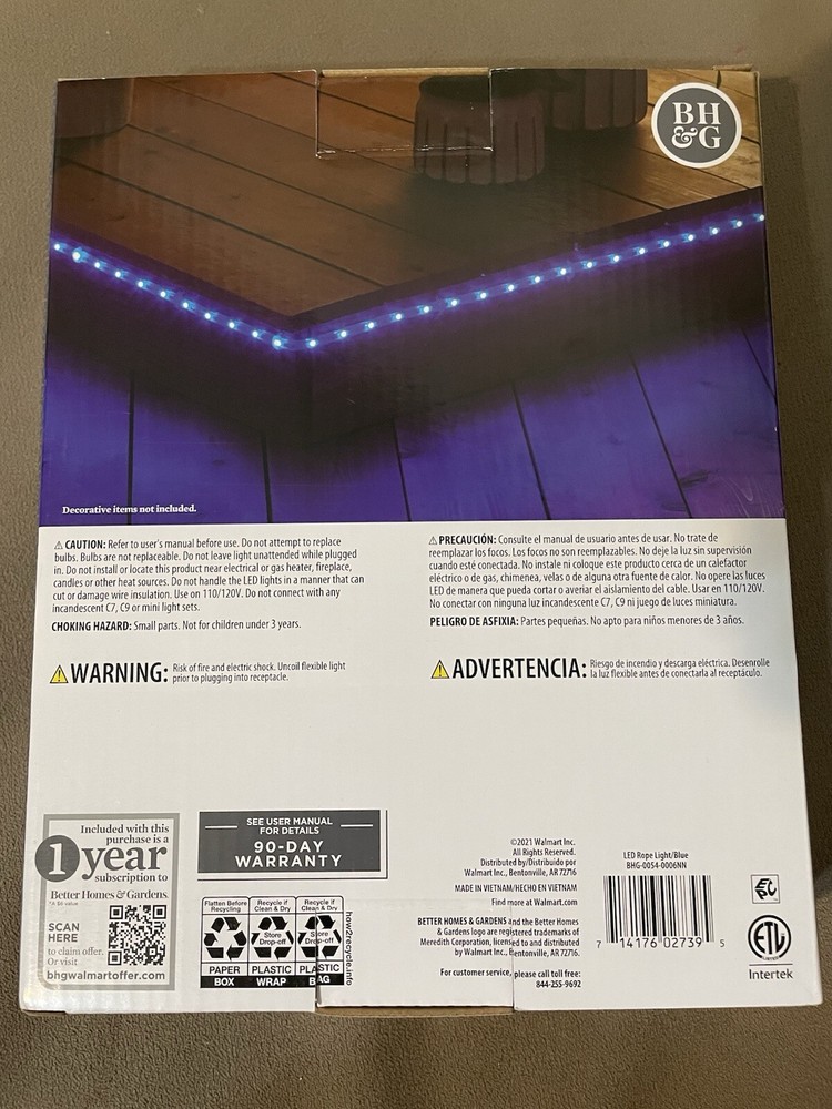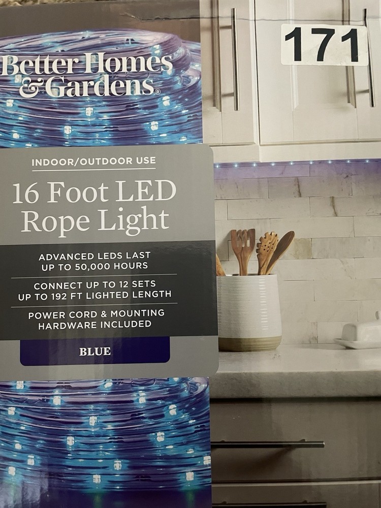 The Better Homes & Gardens 16 Feet Blue LED Strip Light can be connected to up to 12 lights for indoor and outdoor use. It features a flexible rope/wire design with a wall switch control style. The LED technology provides a bright blue light with a clear cord color. This energy-efficient light has a 5-star Energy Star rating and is suitable for any occasion.